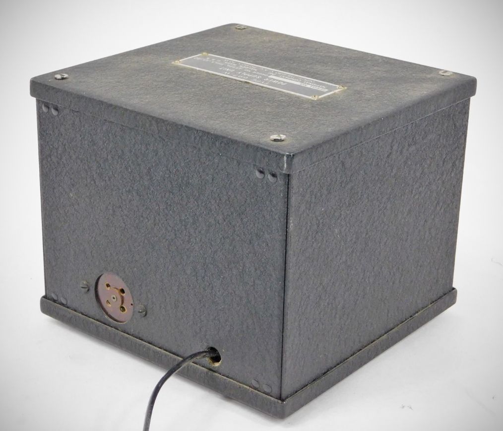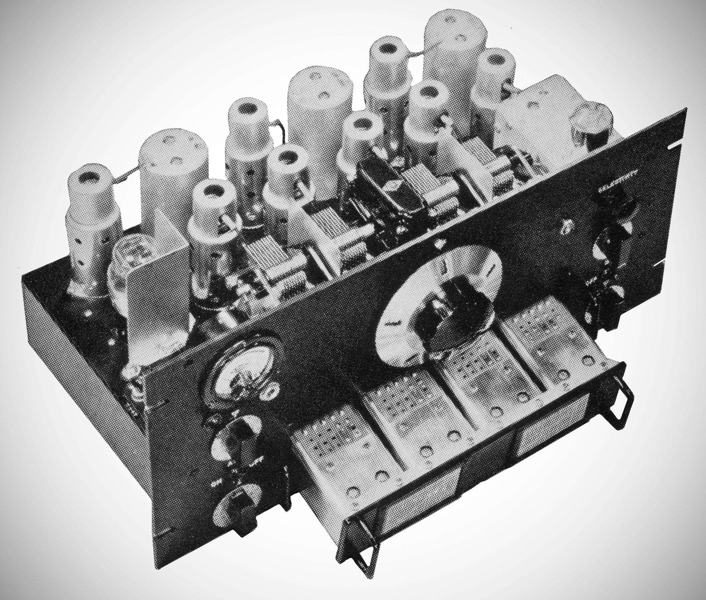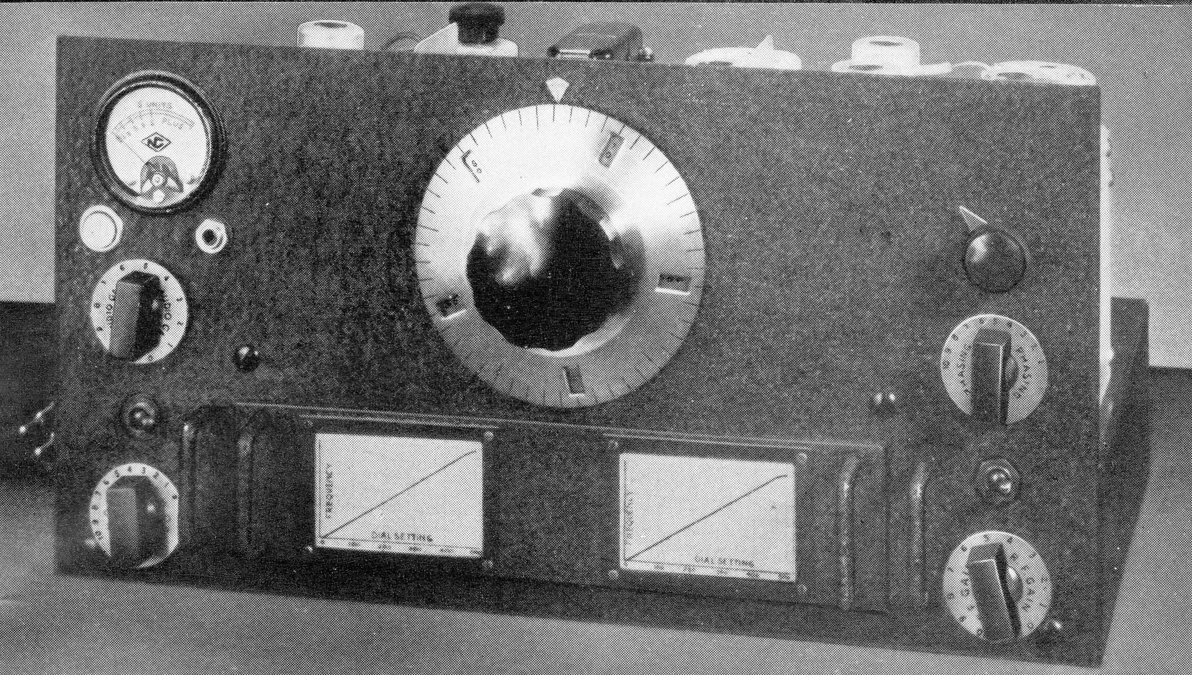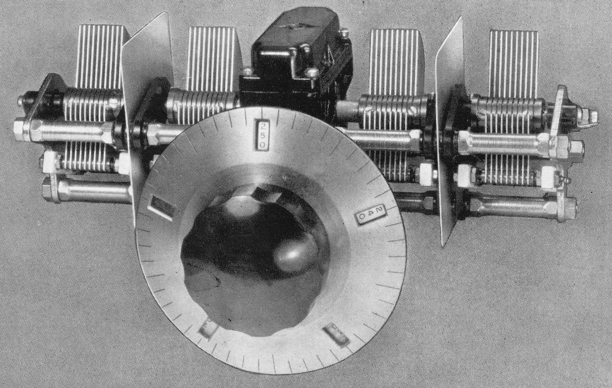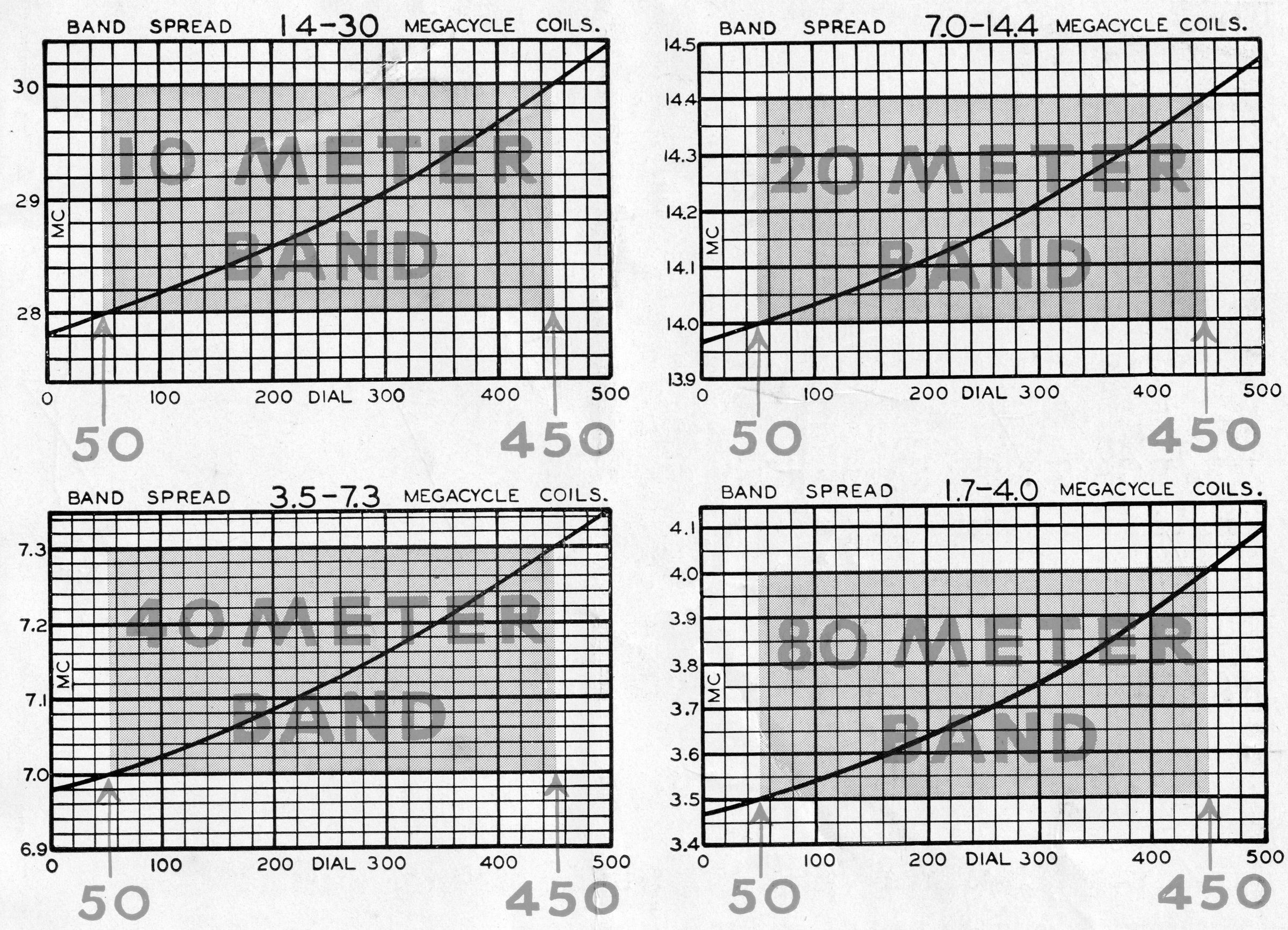 The Micrometer Dial reads direct to one part in 500. Division lines are approximately 1/4" apart. The dial revolves ten times in covering the tuning range, and the numbers visible through the small windows change every revolution to give consecutive numbering by tens from 0 to 500, and provides about 12 linear feet of tuning. The condenser is of extremely rigid construction, with four bearings on the rotor shaft. The drive, at the midpoint of the rotor, is through an enclosed preloaded worm gear with 20 to 1 ratio. Each rotor is individually insulated from the frame, and each has its own individual rotor contact. Stator insulation is steatite. Plate shape is straight-line frequency when the frequency range is 2:1.