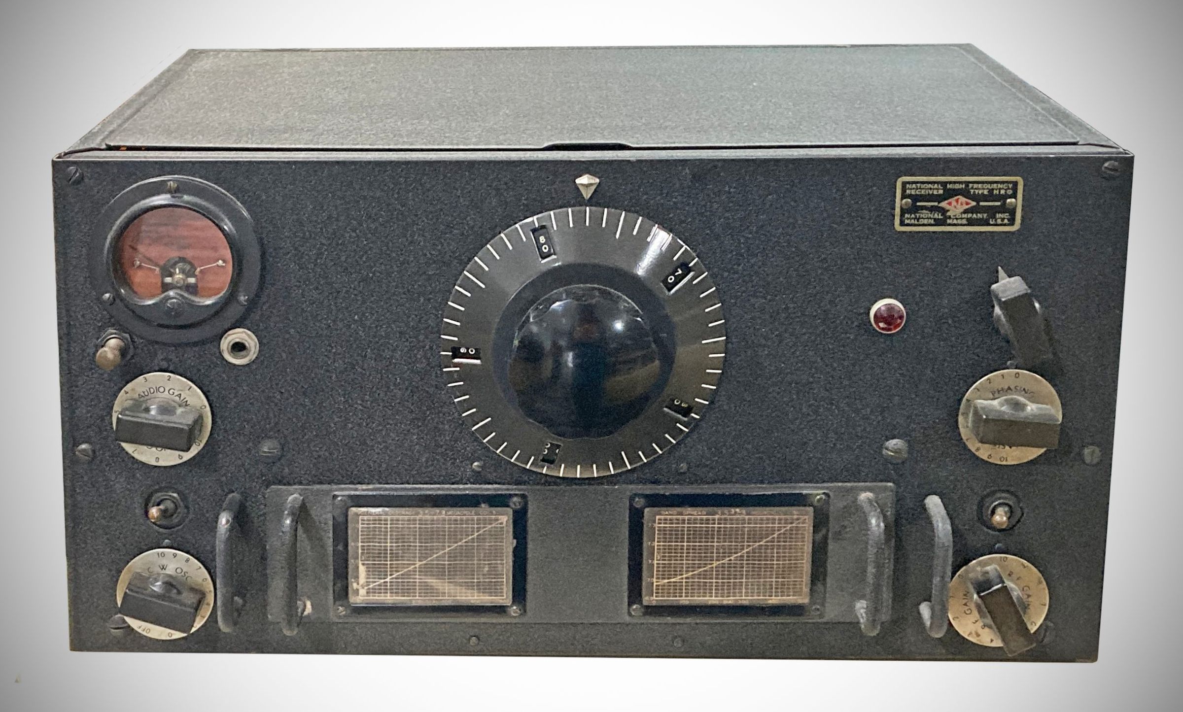 Variation 2 of the HRO added a power lamp to the front panel and changed the S-meter switch to a push/pull type. A rack-mount model was also available.
