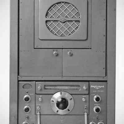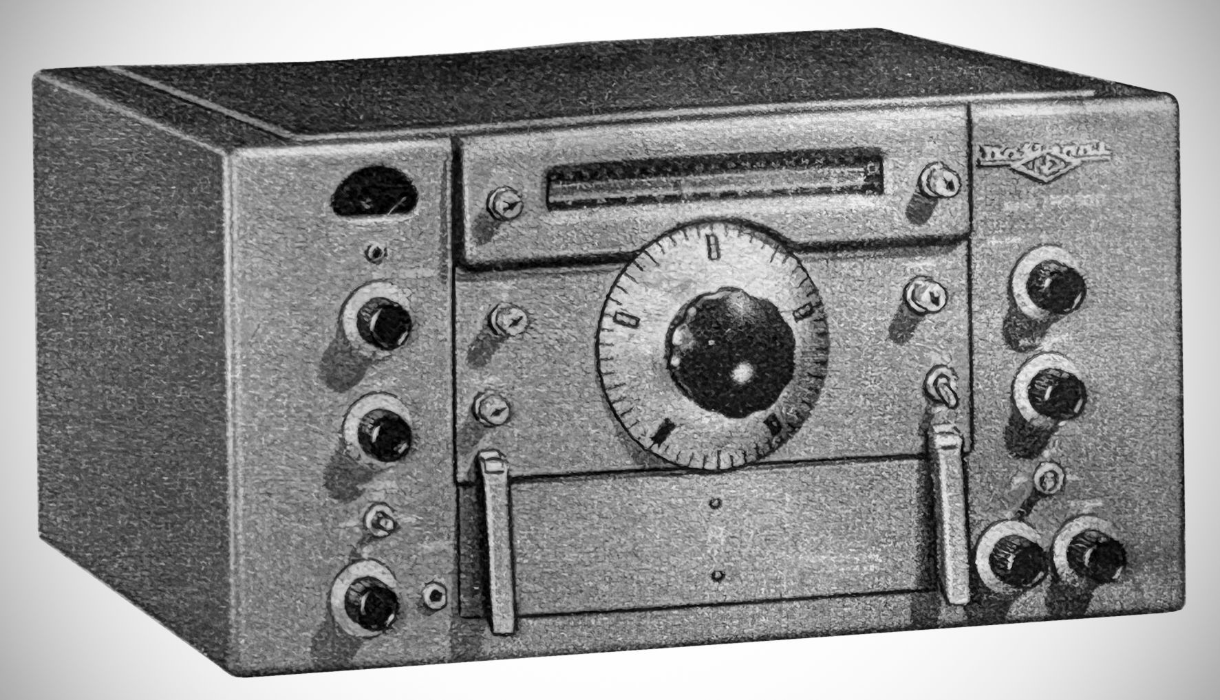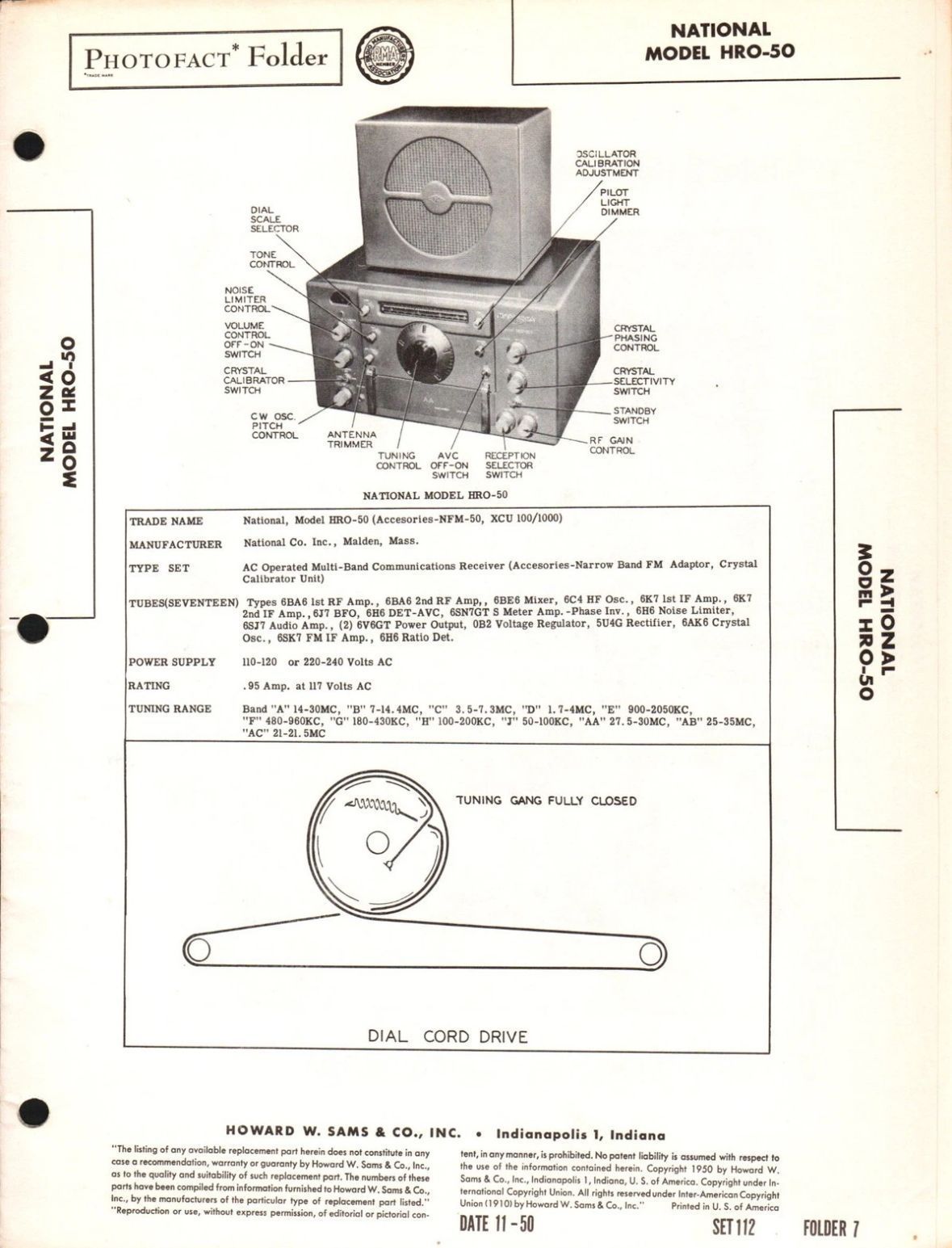 The HR0-50 was introduced in 1950 and was the first HRO to have a direct-reading slide-rule dial in addition to the standard PW main-tuning dial. It also broke with HRO tradition by incorporating an internal power supply. The 15-tube, single-conversion set had a crystal filter and a 455 kHz IF. It tuned from 50-430 kHz and from 0.48-35 MHz using a dozen plug-in coil sets. In addition to AM and CW, the HR0-50 could receive NBFM signals when equipped with the NFM-50 adapter. 1951 saw the introduction of the HR0-50-1. The -1 models added an additional IF stage, bringing the tube count to 16, and had cascaded IF transformers for improved skirt selectivity. Optional MRR rack which has the 50SC coil cabinet and speaker; HR0-50, $349.00, HR0-50-1, $383.50.