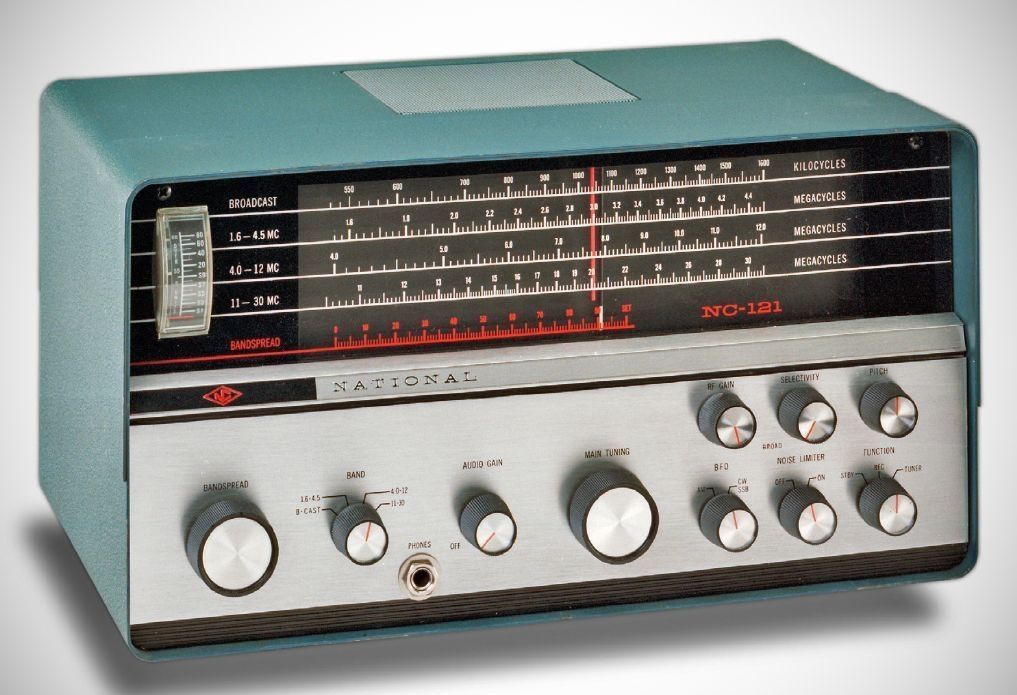 The six-tube NC-121 was a single-conversion set covering 0.55–30 MHz. It had a built-in 5 inch speaker and a Q-Multiplier. The NC-121 had separate detectors for AM and CW/SSB. The main tuning dial was directly calibrated and band spread used a 0–100 logging scale.