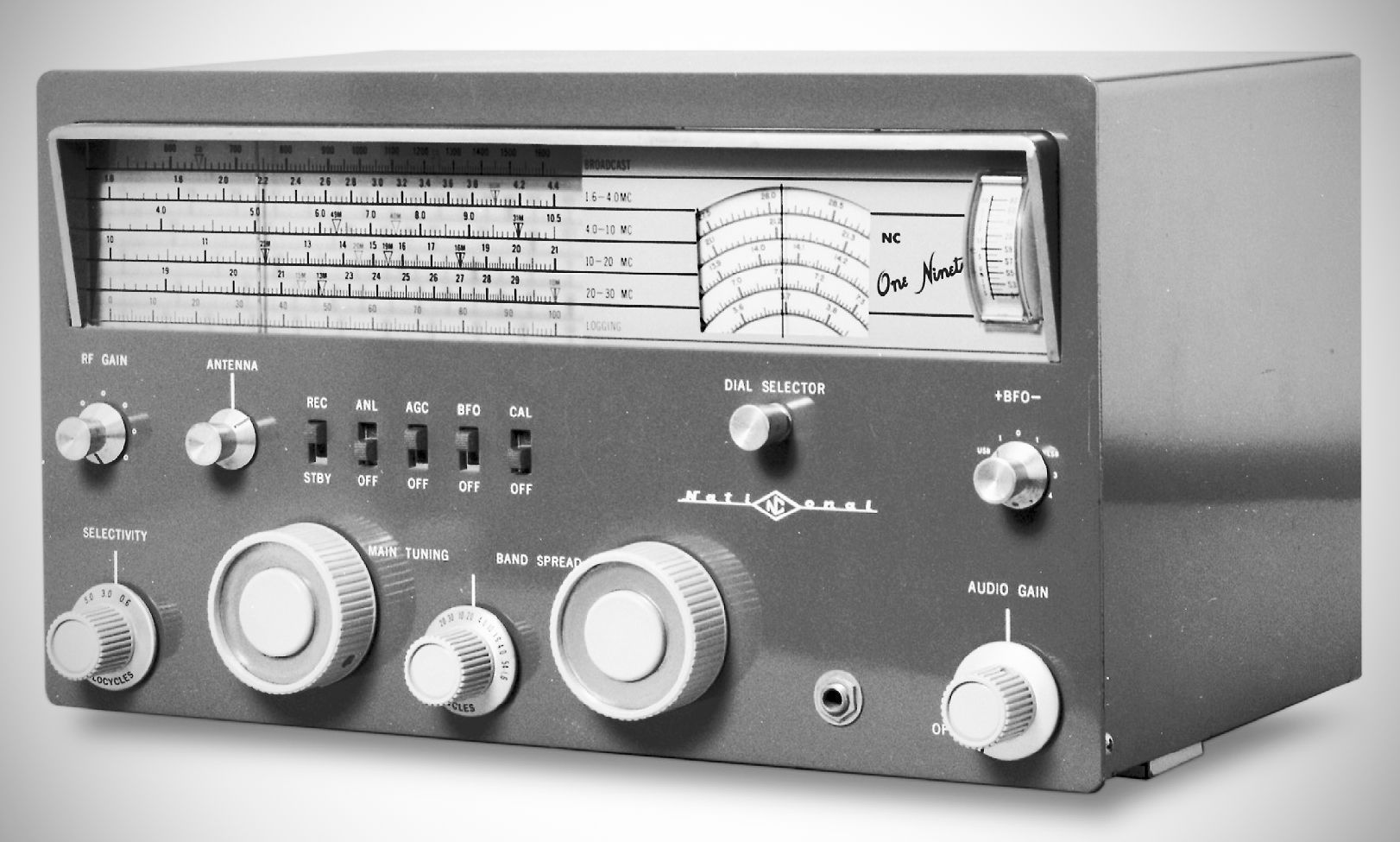 The NC-190 featured National’s “Cosmic Blue” finish.The 10-tube, double-conversion receiver had selectable ham or SWL band-spread dials. It tuned from .54–30 MHz and had IFs at 2215 and 230 kHz. The second IF incorporated National’s Ferrite Filter. Two separate band spread dials available with a front panel selector. See CQ, Jun 1961, inside back cover.