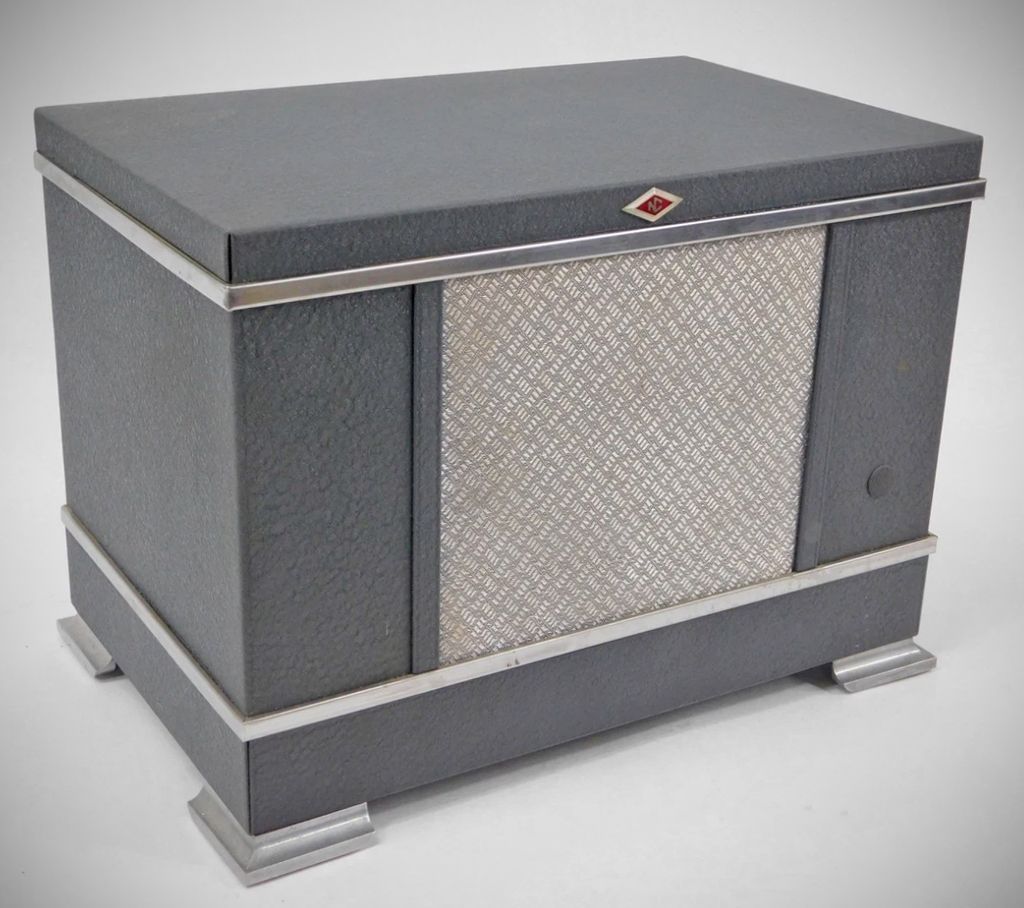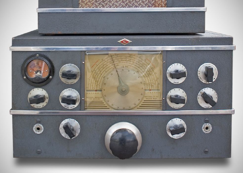 The 12-tube set covered 0.49–30 MHz in six bands. Band switching the NC-2-40C was accomplished by pulling out the main-tuning knob, which engaged gears on the receiver’s moving-coil catacomb. Turning the knob shifted the coil rack until the desired band was selected. When the knob was pushed back in, it re-engaged the tuning capacitor.