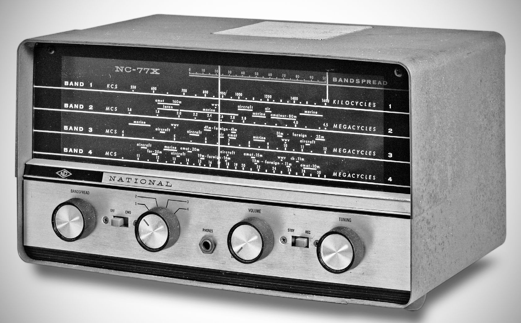 The NC-77X covered .54–31 MHz in four bands. The amateur bands were marked on the main tuning dial and band-spread tuning was calibrated with a 0–100 logging scale. The single-conversion set used five tubes.
