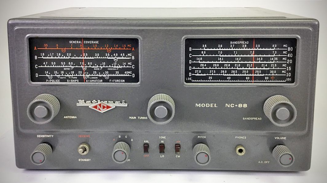 The NC-88 "World Master" receiver covered 0.54-40 MHz with calibrated band spread for the 80, 40, 20, and 10 meter amateur bands. The nine-tube set had two high-fidelity audio stages and a phono input.