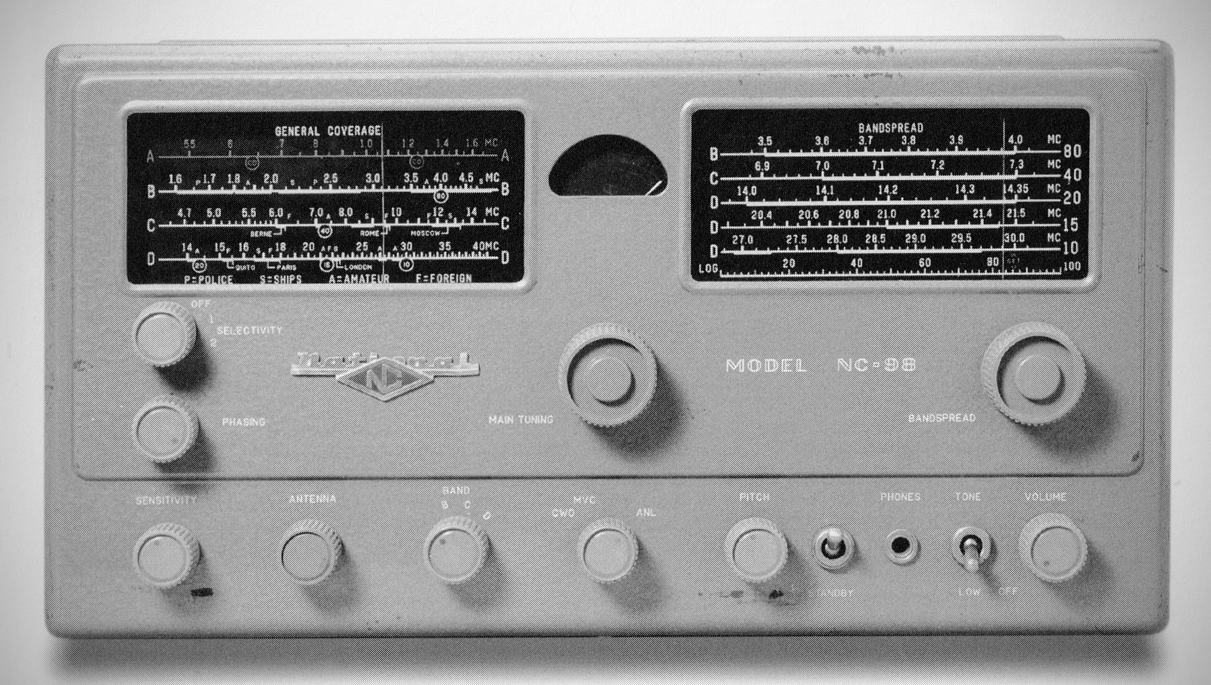 The NC-98 added a crystal filter, variable selectivity, and an S-meter to the basic NC-88 circuit. It had the same tube lineup and coverage. The NC-98SW model substituted shortwave-broadcast calibration for ham-band calibration on the band-spread dial.