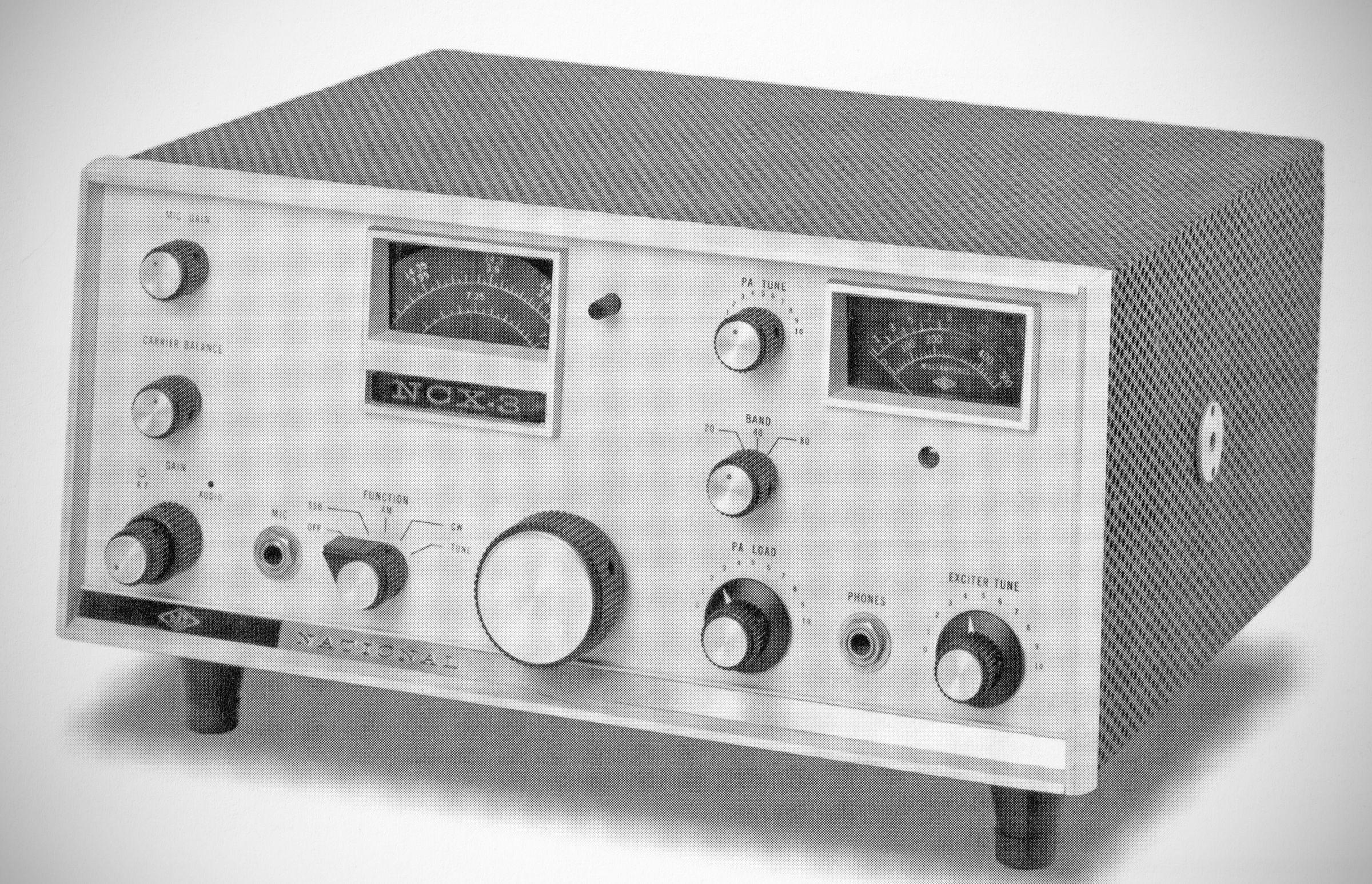 The NCX-3 transceiver covered the 80, 40, and 20 meter bands. It had PTT or VOX operation on SSB and break-in on CW. It was lower sideband on 80 and 40, upper sideband on 20. Power input was 200 watts PEP on SSB, 180 watts on CW, and 100 watts on AM. National's tri-band transceiver used 18 tubes and 6 diodes. The final amplifier was a pair of 6GJ5s.