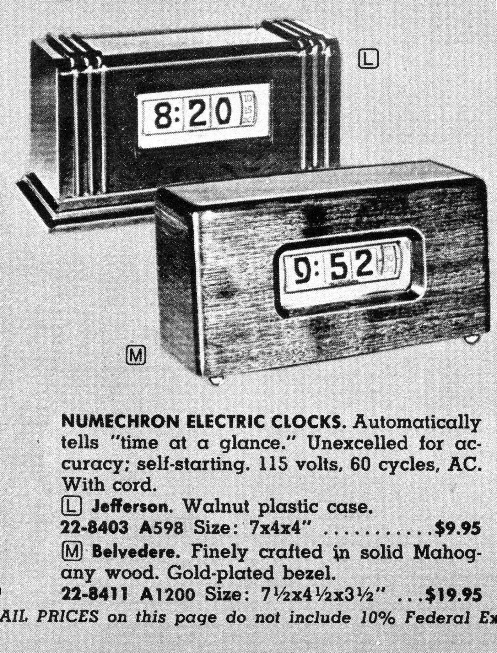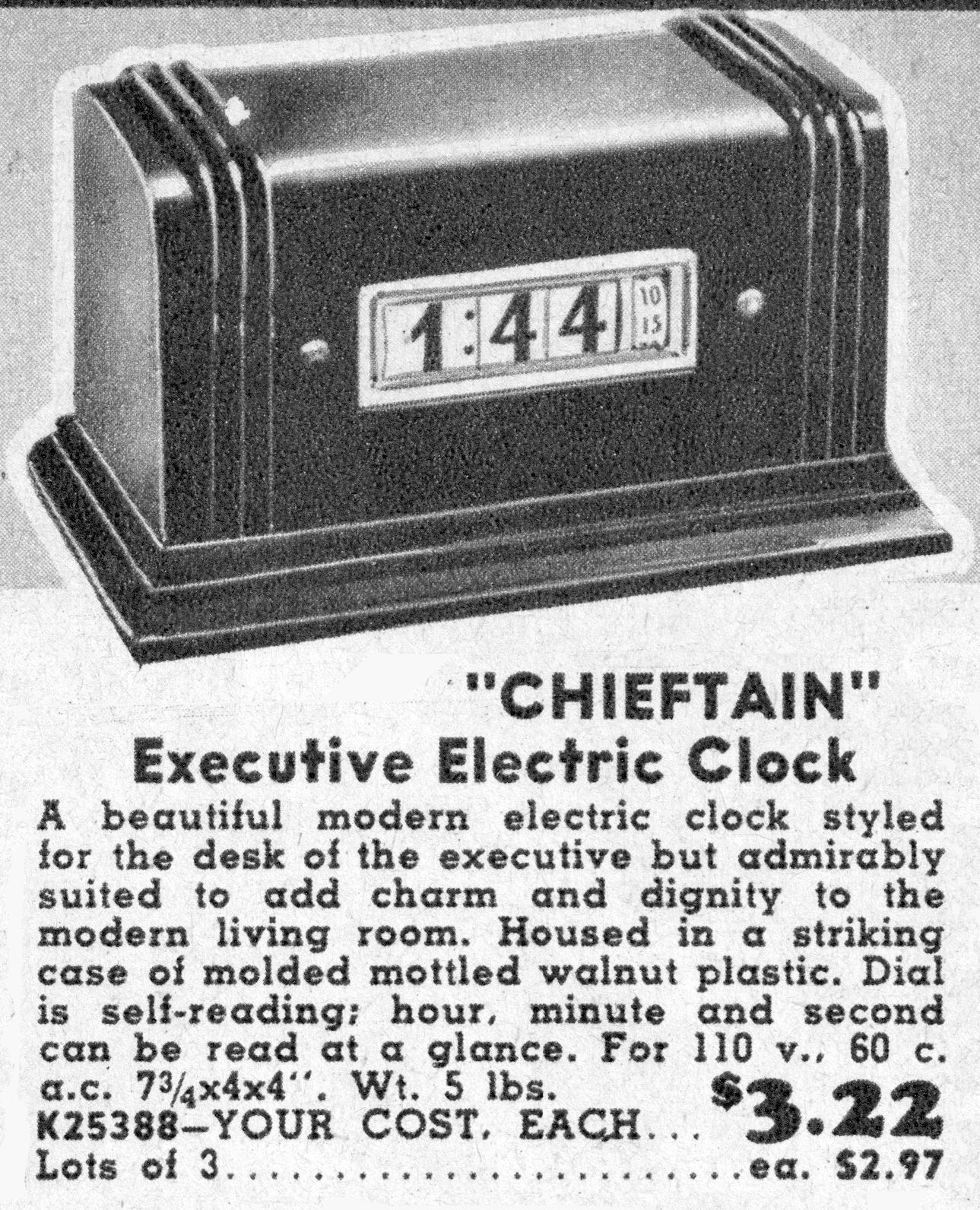 The model 100 clock (arguably the most popular model with amateur radio operators) dates from about 1938, and a 12-hour version can be found in Wholesale Radio Service Company's 1938 Lafayette catalog, where it is referred to as the "Chieftain," rather than the model 100. The 100 also appears in the 1956 John Plain company (Chicago) catalog where it is listed at the "Jefferson" model.