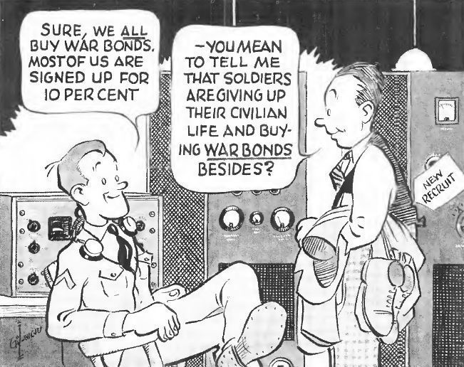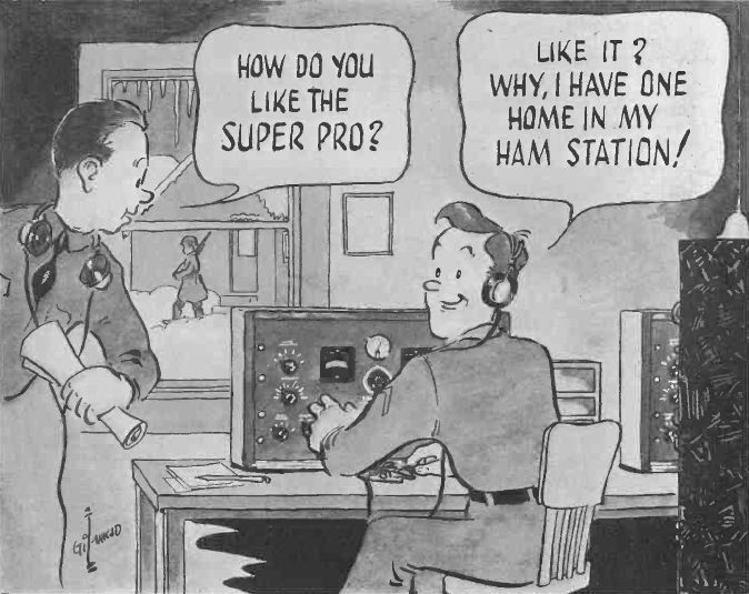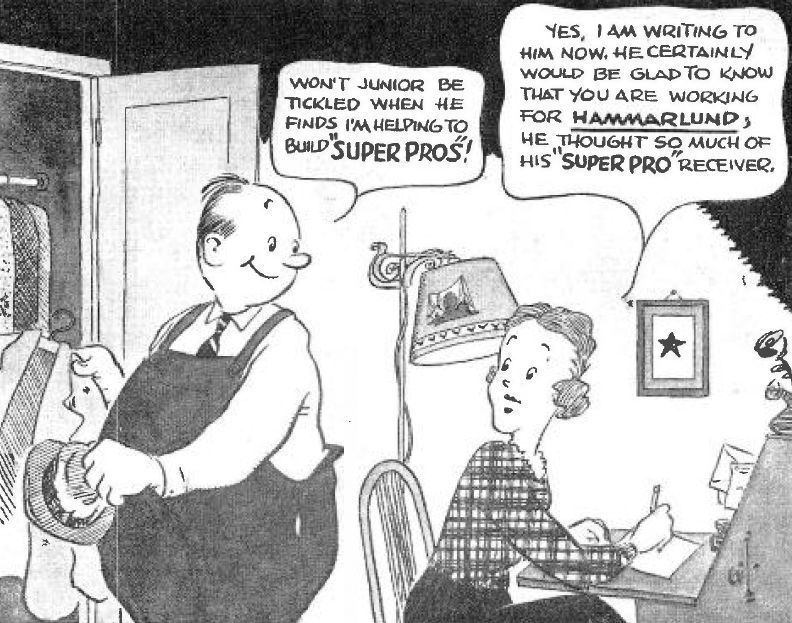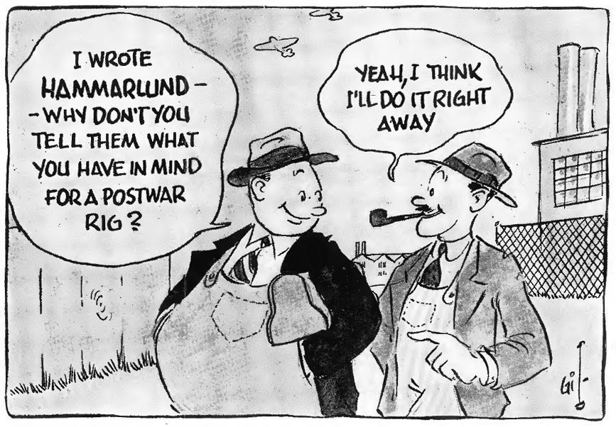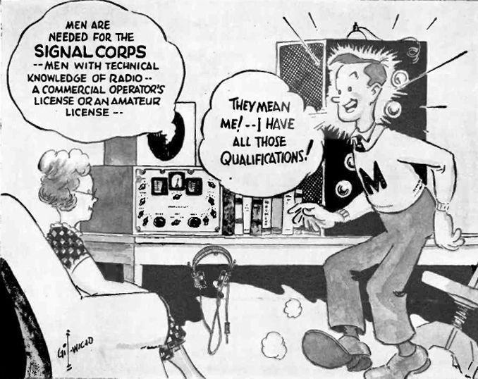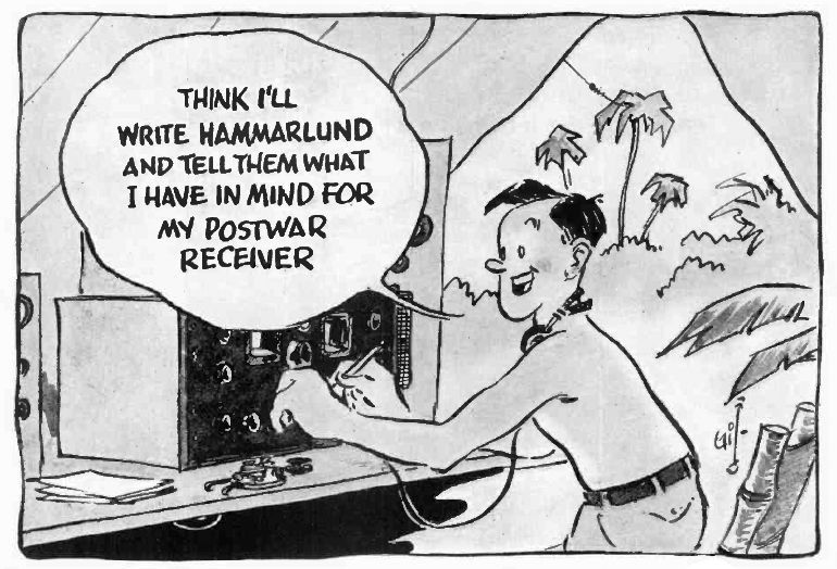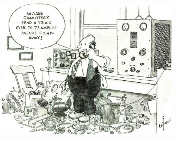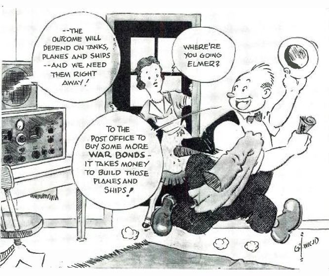 A rare example of a Gil cartoon outside of QST magazine. This series was done for Hammarlund during WWII, promoting various aspects of the war effort. Image: Radio News, Sep 1942, p 45.