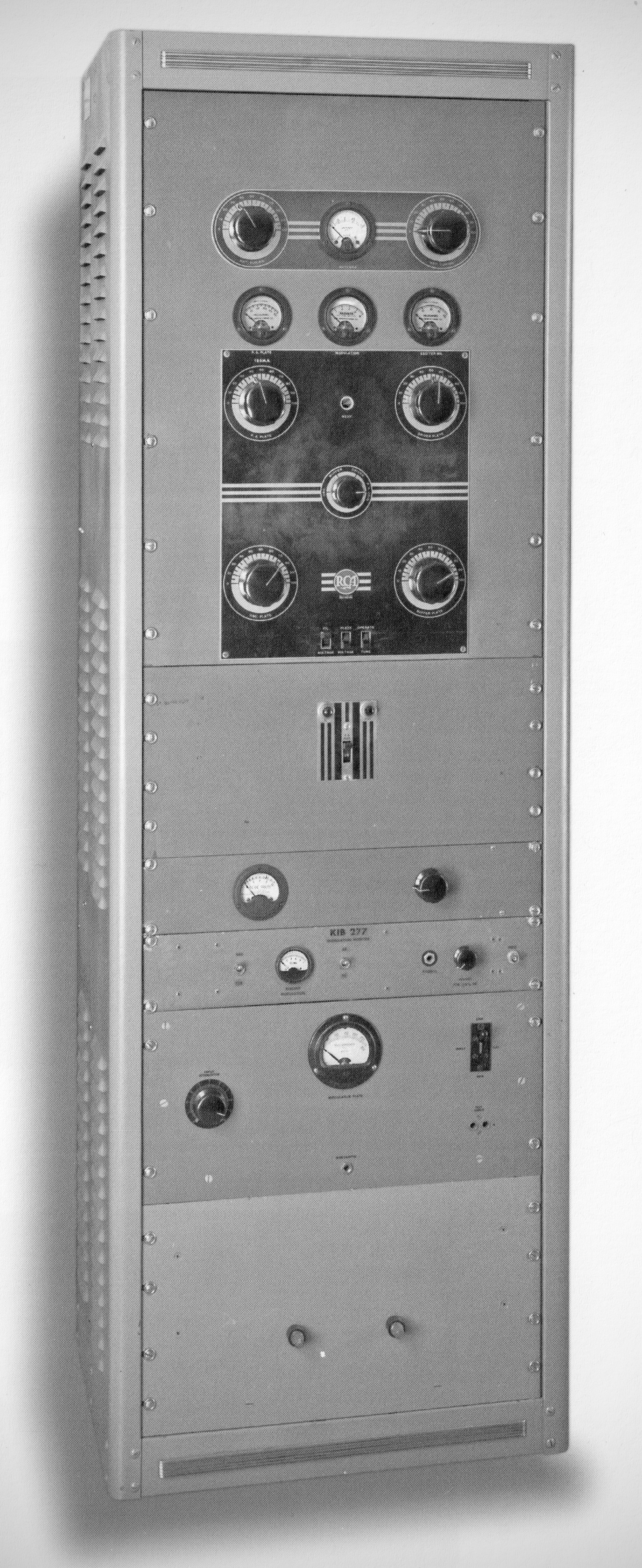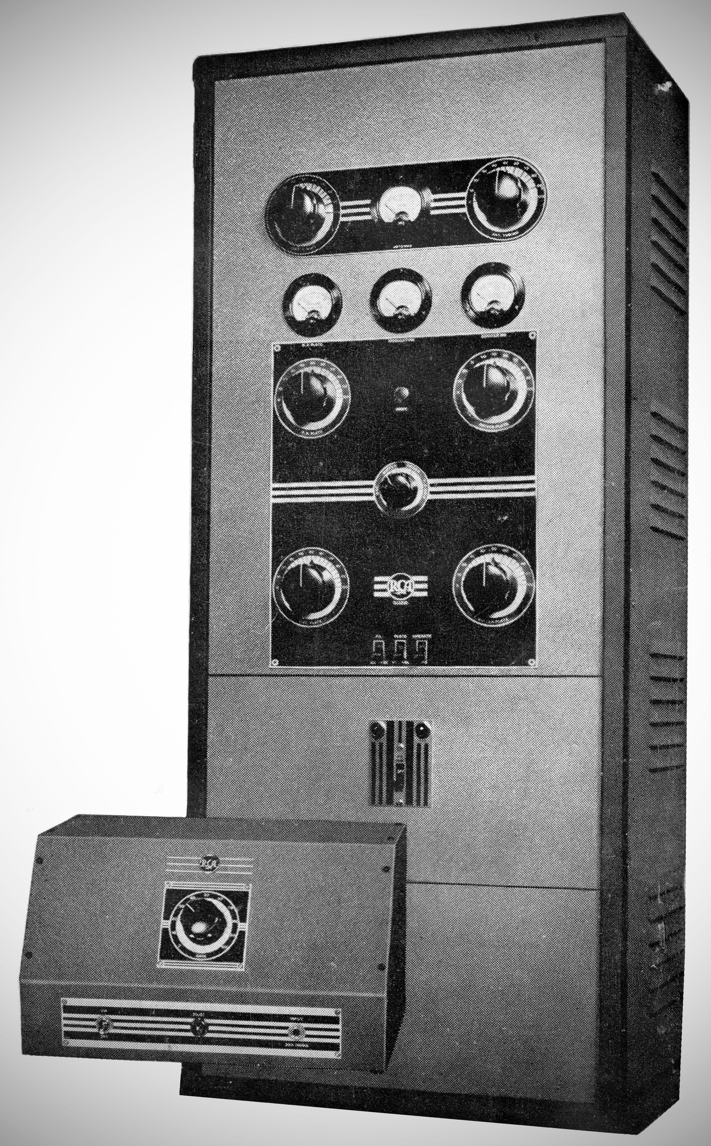 The Radio Corporation of America's 150-watt output phone and CW transmitter had a pair of 808s in the final amplifier. A pair of 808s served as modulators on phone. Plug-in coils were used to cover 160-10 meters. The transmitter's circuits were fully metered. $625.00 (with one set of coils, but minus tubes).