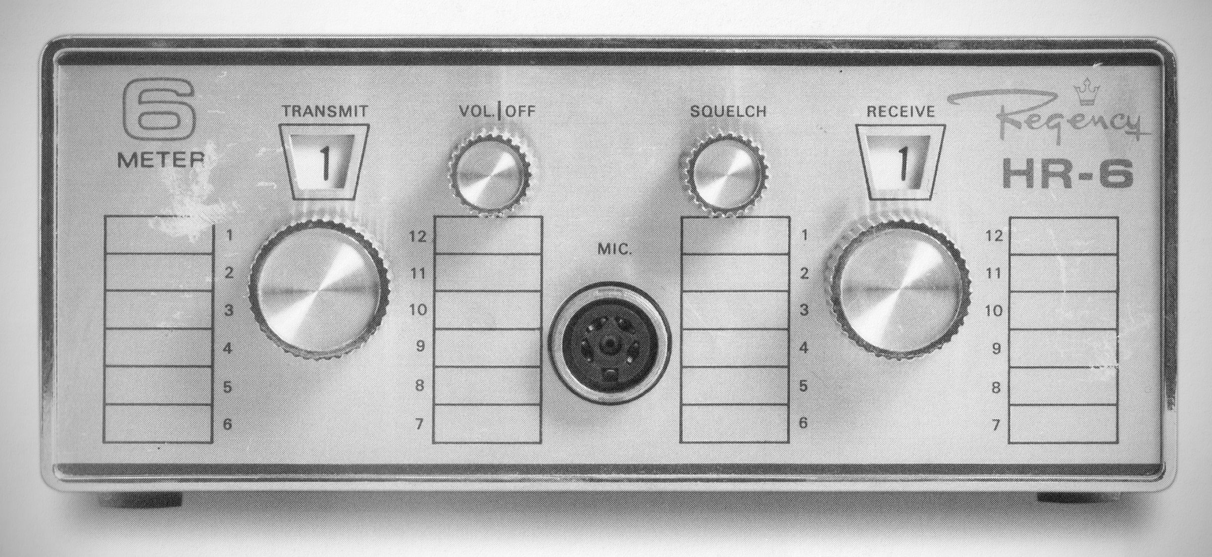 The HR-6 had 12 independently-switchable crystal channels covering the 52–54 MHz repeater allocation on 6 meters. Power output was 25 watts and FM deviation was adjustable up to ± 15 kHz on transmit. An adapter was available to reduce bandwidth of receiver modulation acceptance to 8 kHz; $239.00, 1975. (1)