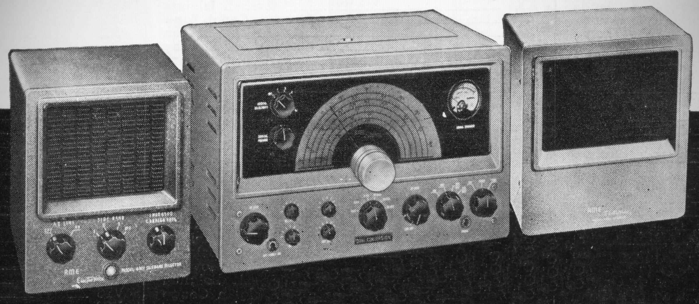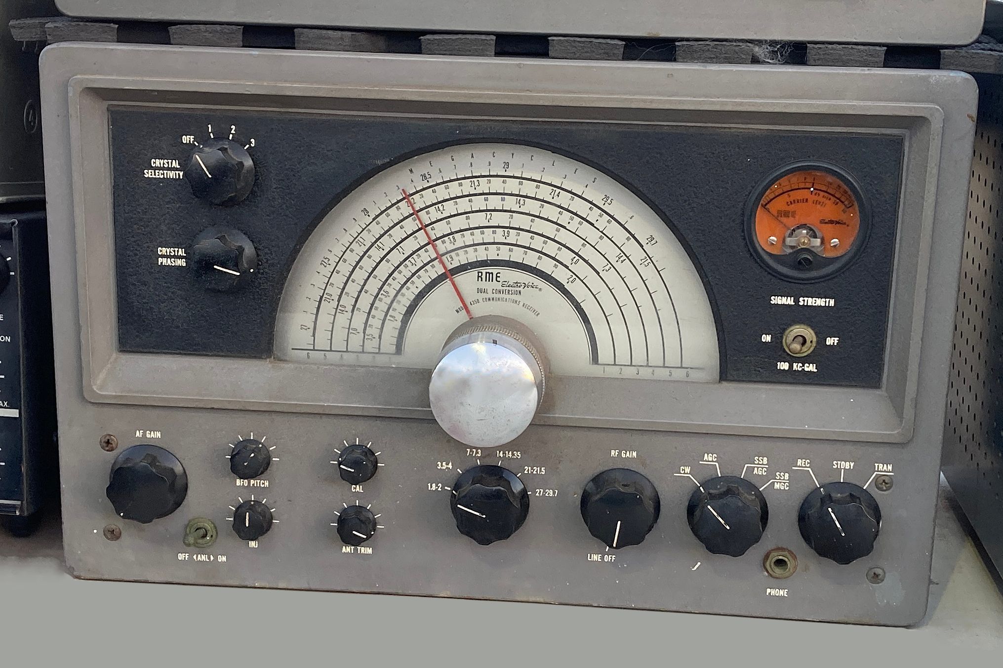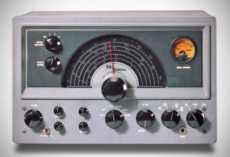 The RME 4350, a double-conversion receiver, had its roots in the single-conversion RME 4300 design. It used nine tubes and covered the 160–10 meter bands. It had 2195 and 455 kHz IFs, with a crystal filter in the latter.