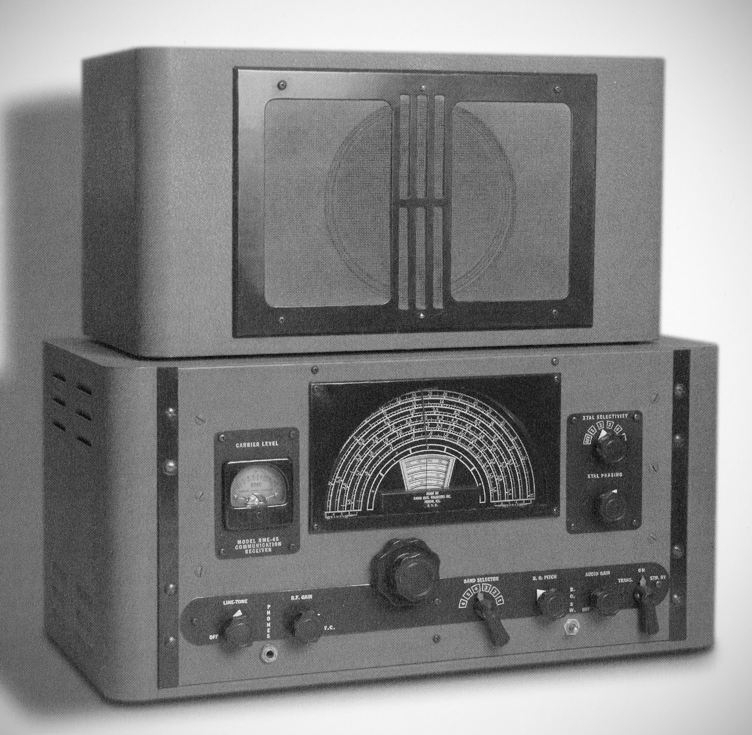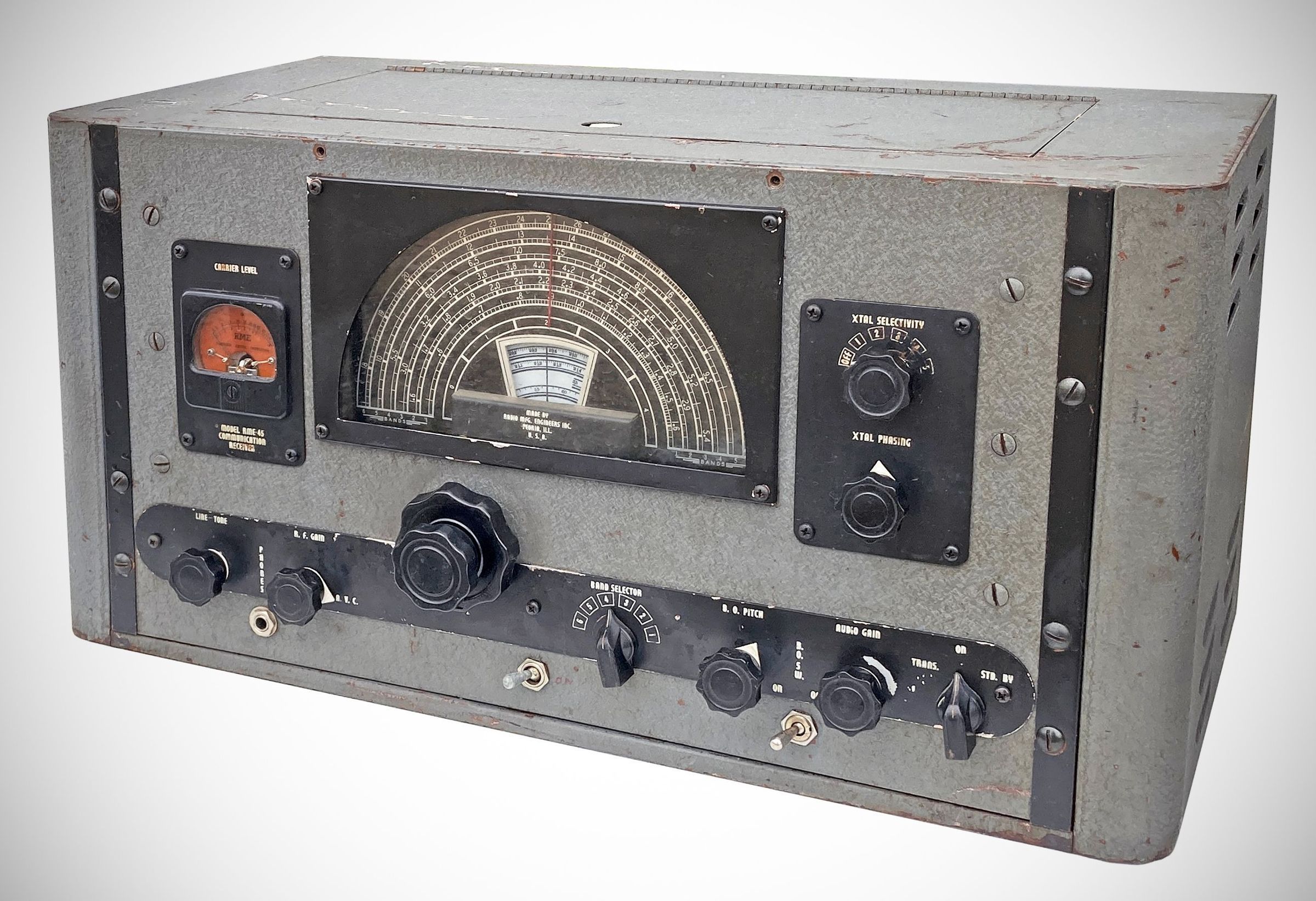 Radio Manufacturing Engineers' first post-war receiver (probably the first post-war receiver) built on the company's designs of the pre-war and war years. The initial model, the RME-45, was introduced in mid-1945. Early the following year, the Peoria, Illinois company released the 45B, adding two-speed tuning, calibrated band spread for the ham bands, and improved noise limiting. The receiver covered 0.55-33 MHz and used 10 tubes, alllocktals except for the rectifier and voltage regulator.