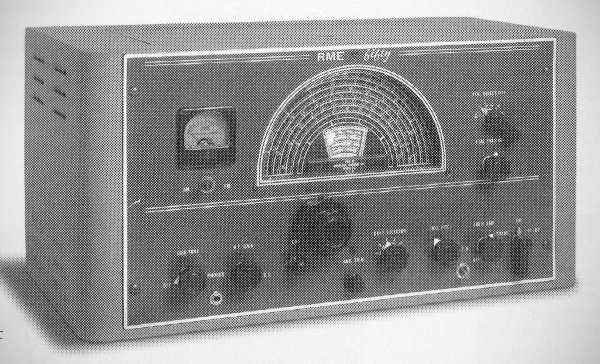 The RME-50 used the basic circuitry of the RME-458, substituting miniature tubes for loctals used in the older receiver. It also used a 6V6 in the audio output stage, a VR-150 voltage regulator, and a 5Y3 rectifier. The 12-tube set came with RME's NBF4 NBFM adapter installed. Frequency coverage was 0.54-33 MHz in six bands; $197.50 (including speaker).