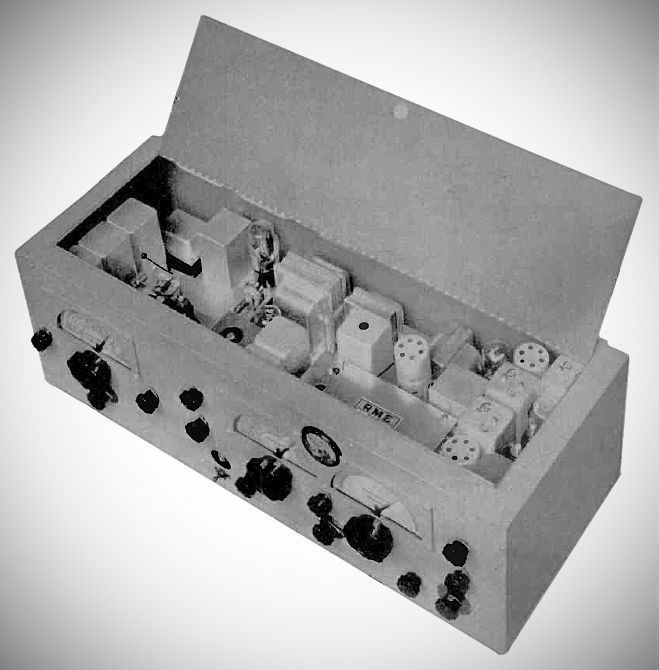 The six-tube, nine-band RME-69 was the company’s most popular receiver model. Included were a noise limiter, an R-meter (S-meter), and an on-air monitor circuit. RME called the model 69 a single-signal super, referring to the crystal filters ability to reject an incoming signal on one side of zero beat. Main tuning and electrical band-spread dials covered 0.55–32 MHz. The RME-69 acquitted itself well in performance tests with other leading receivers of the day.
