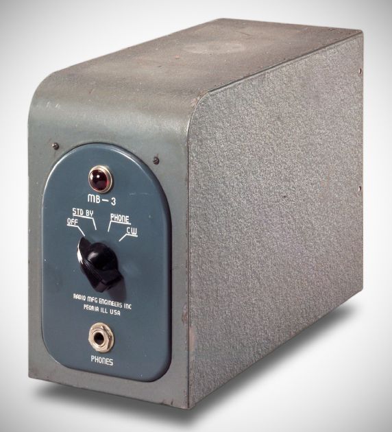 The MB-3 Boomerang was a monitoring device for CW and phone signals. It silenced the receiver while the transmitter was keyed and incoming signals could be heard between characters on CW. The MB-3 plugged into the receiver’s phone jack and had an internal AC supply.