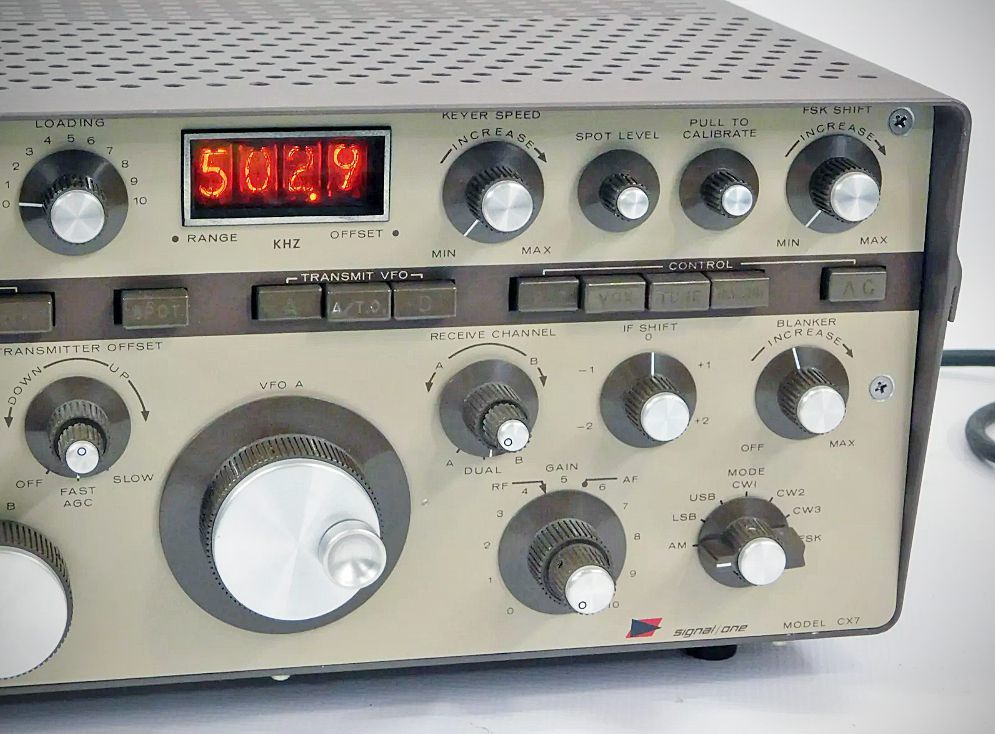 Signal/One introduced the concept of the high-performance, integrated station. It included two PTOs, an IC keyer, an RF clipper, a noise blanker, and a 115/230 VAC power supply. The CX-7 covered the amateur bands between 1.8-29.7 MHz and optional crystals permitted operation on three other 1 MHz segments. The Nixie tube digital readout displayed frequency down to 100 Hz. The transceiver was solid-state except for the RCA 8072 output tube. The final amplifier was rated at 300 watts peak input. The output was broad-banded and manual tuning was necessary only when the load's SWR exceeded 1.5:1. The receiver used a pair of sharp filters and electronic IF shift. Signal/One was owned by ECI of St. Petersburg, Florida, a division of NCR. By the time the CX-7A debuted (1971), Signal/One had become a division of Computer Measurements, Inc. of Gardena, California.
