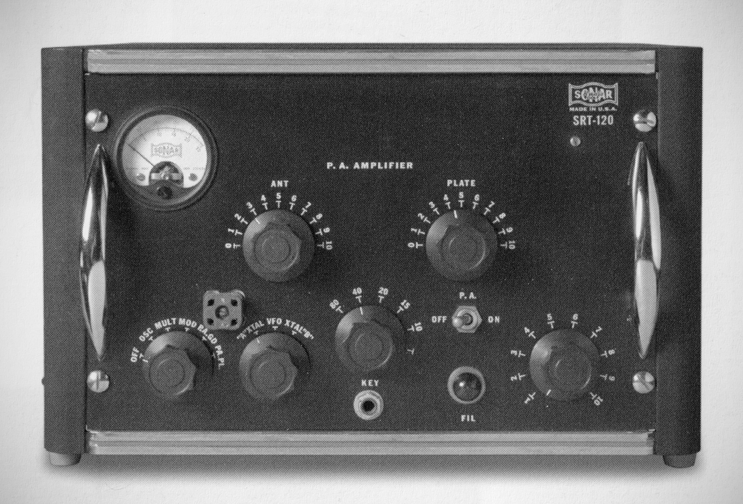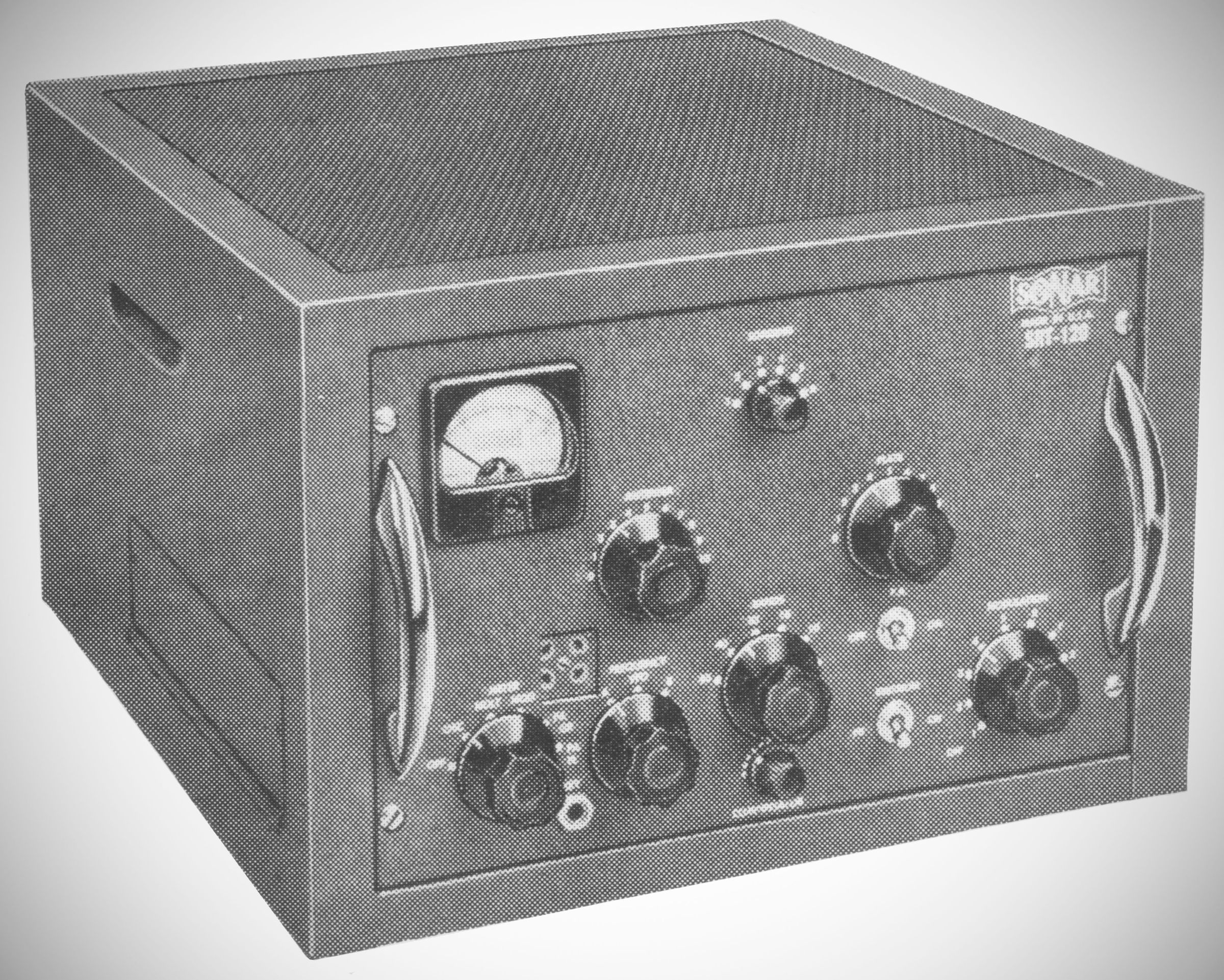 Sonar designed the SRT-120 for either mobile or fixed-station use. Power input to its 9903/5894A final was 120 watts CW, 100 watts AM. It had band-switch positions for 80, 40, 20, 15, and 10-11 meters, plus a spare position for another band.