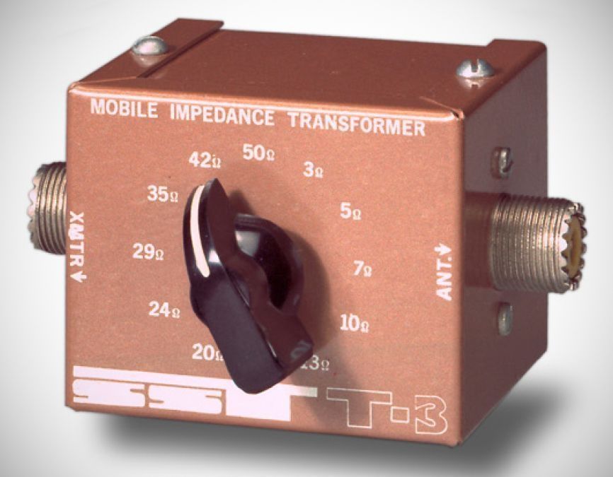 SST Electronics made a line of simple antenna tuners. The T-3 impedance transformer was designed to match the low impedances presented by mobile antennas. It covered 1–30 MHz, and its 12 coil taps spanned a range of 3 to 52 ohms. The T-3 was rated at 300 watts.