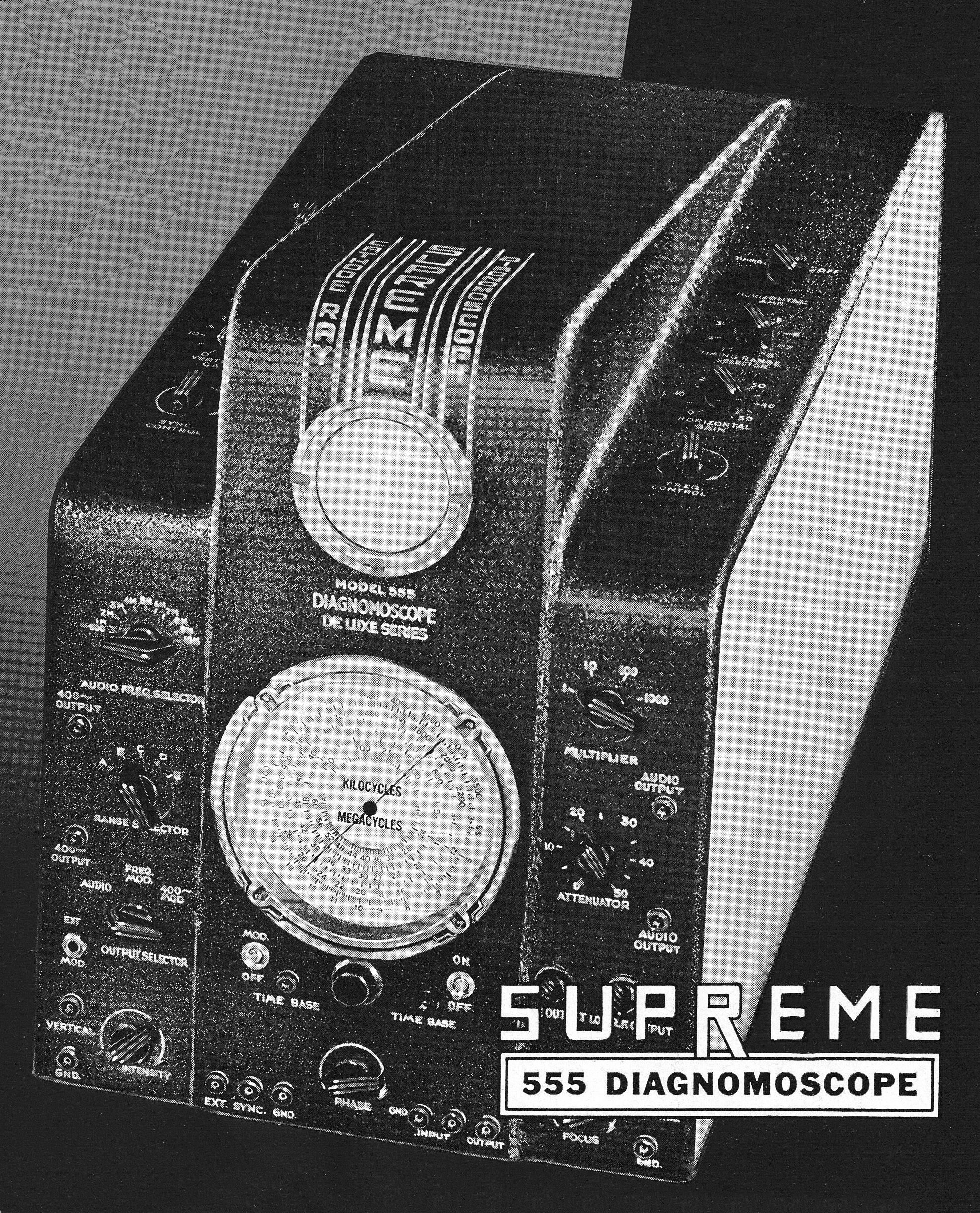 The 555 included an RF signal generator, an AF signal generator, and a wobbulator, in addition to the scope itself, and used ten tubes (unspecified).