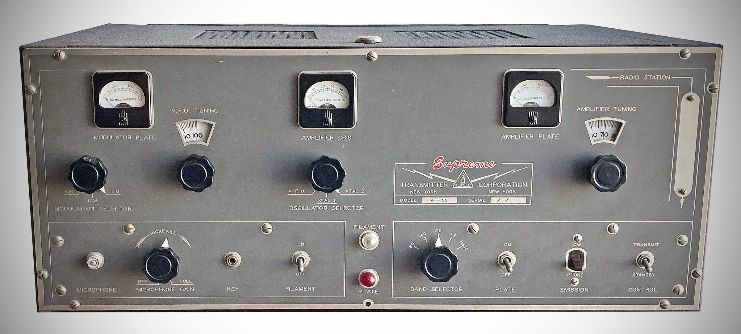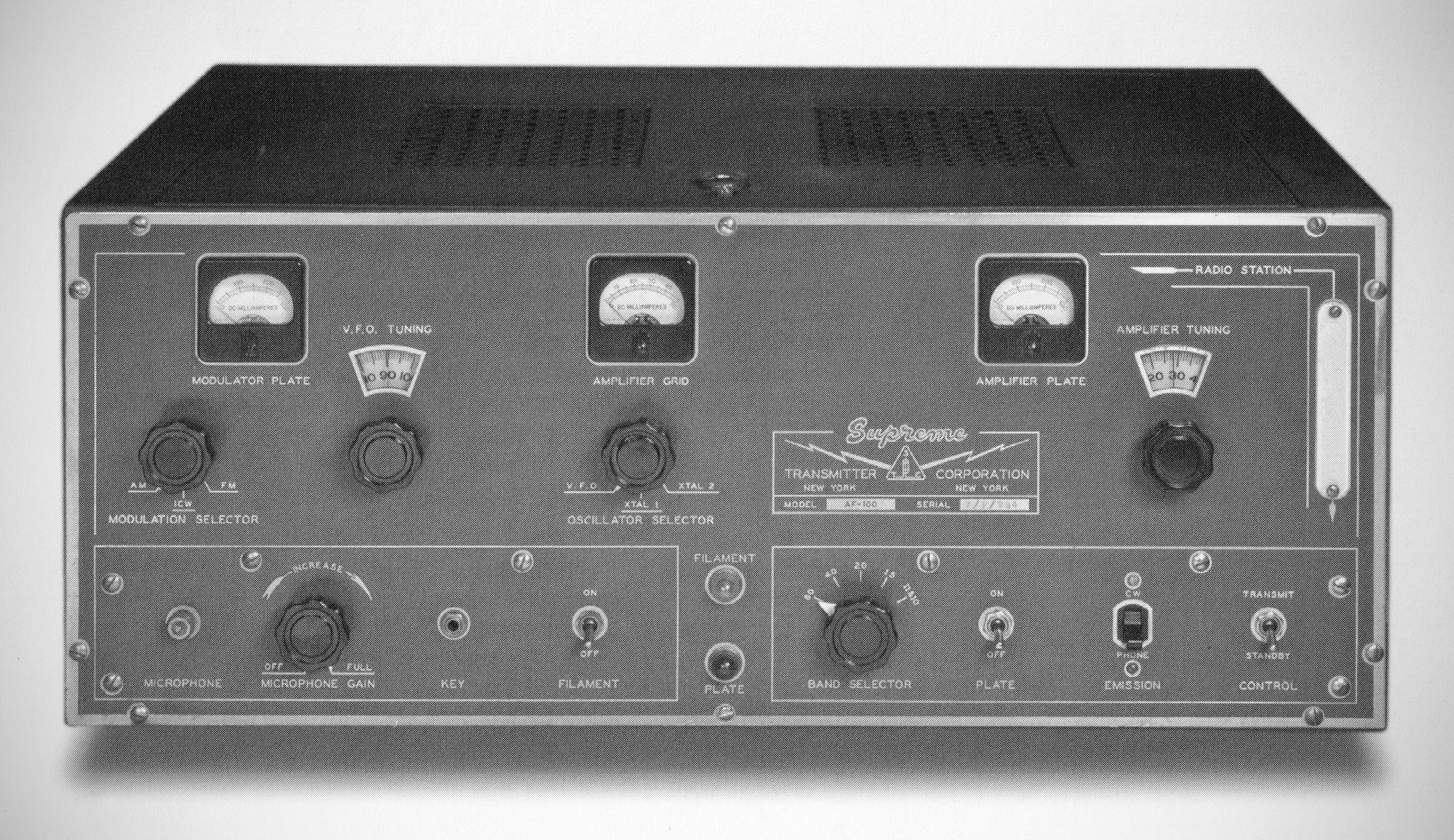 The Supreme Transmitter Corporation's 100-watt transmitter worked CW, AM, and FM on 80 through 10 meters, including the 15 meter band, not yet allocated when the AF-1 00 was introduced in 1946. It used plug-in coils in the 3D23 final.