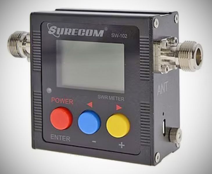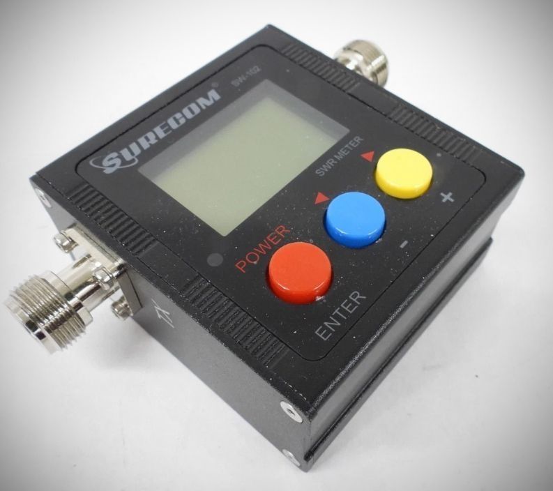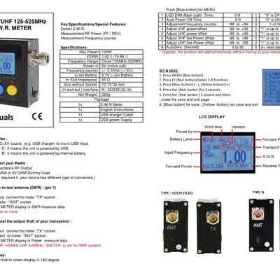 Frequency range: 125–525MHz Measurable power range: 0.5–120W(+-0.5%) Measurable S.W.R range: 1.00:1~19.99:1 Input read frequency counter (must be < 0.5 W) Maximum power: 120 W Impedance: 50Ω Battery: 3.7V Li-ion rechargeable