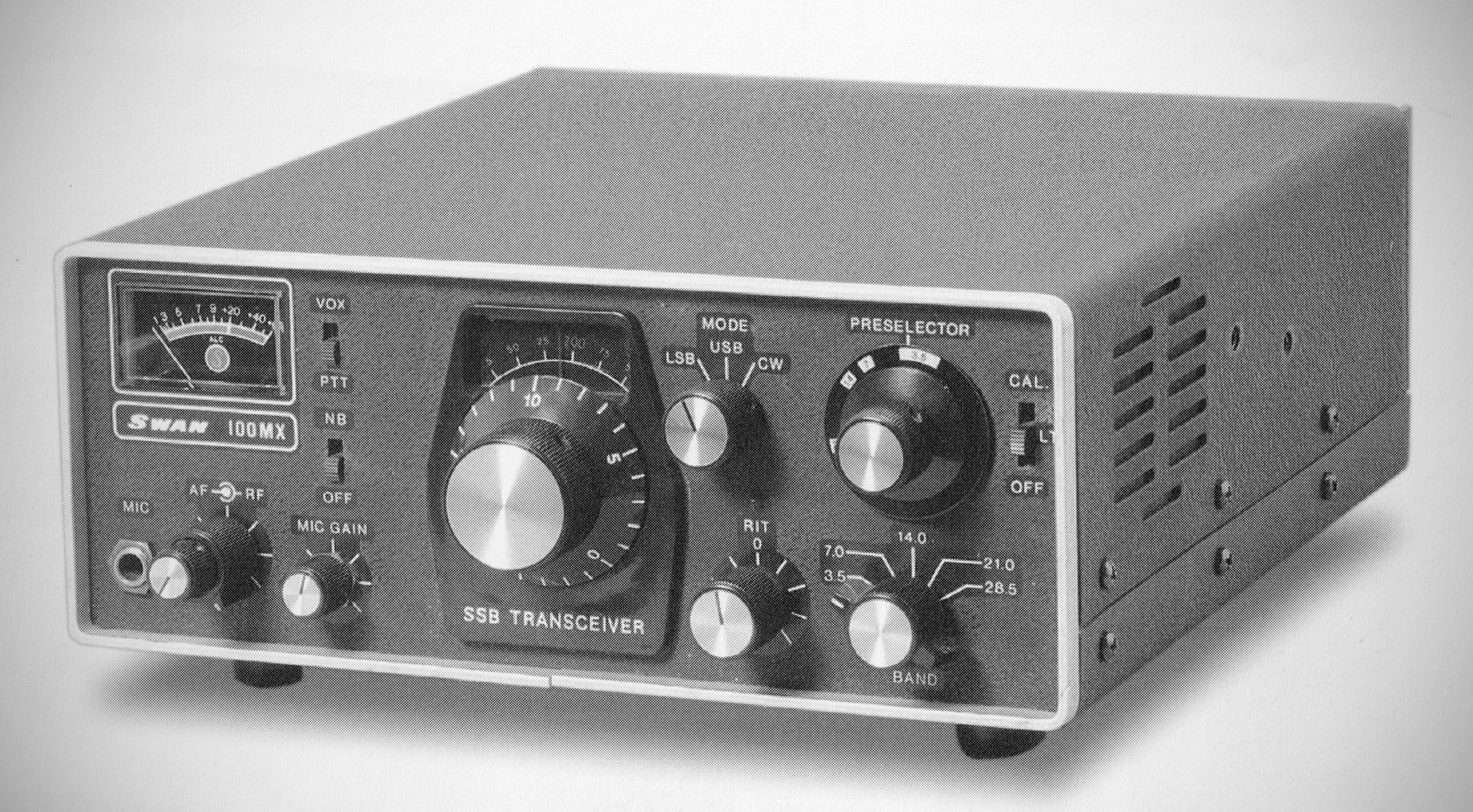 The 100 MX mobile transceiver is completely solid state and incorporates state-of-the-art design and styling. It features a highly reliable, extremely stable Permeability Tuned Oscillator (PTO) with 1-kHz readout resolution; built-in noise blanker and VOX; semi-break-in CW with sidetone; Receiver Incremental Tuning (RIT); 25-kHz built-in calibrator and preselector for transmit and receive.