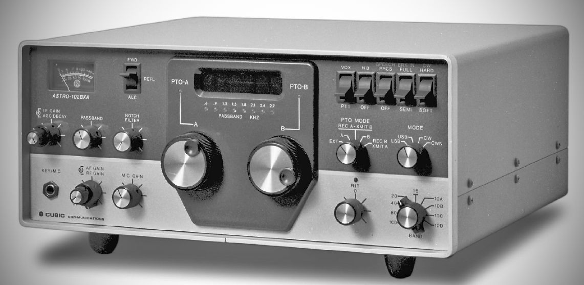 This transceiver was introduced as the Swan Astro-102BX. When it became part of Cubic Commu-nications’ product line, it was christened the 102BXA. Its two PTOs could operate in a split-band mode or either could provide simplex control. Two 8-pole IF filterswere used in cascade for selectivity. A 300 Hz CW filterfurther narrowed the passband. A switch selected full- or semi-break-in. The 102BXA covered 160–10 meters. Power output was 100 watts.