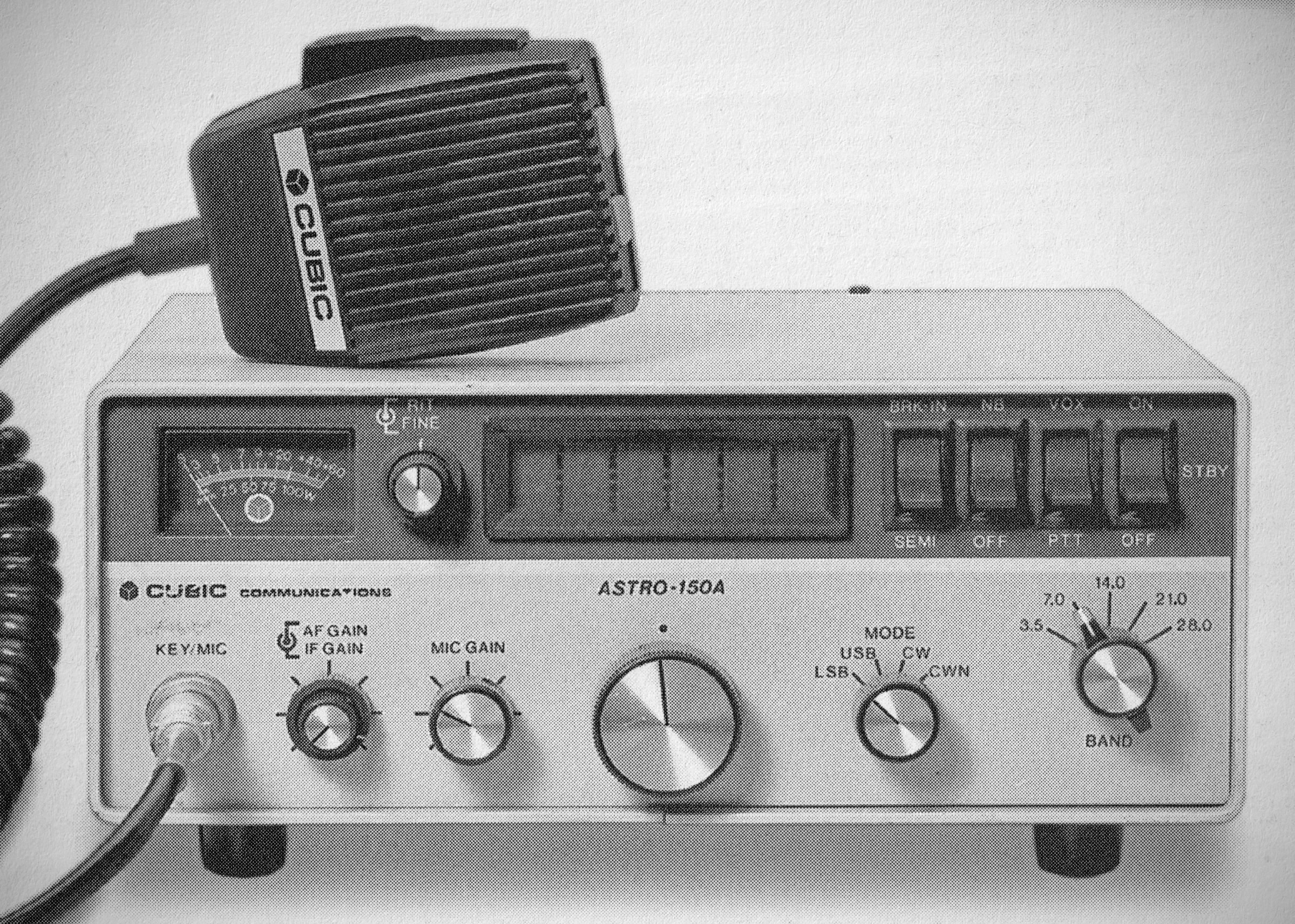 The Cubic Astro-150A started life as the Swan Astro-150. The 100 watt output, 80-10 meter transceiver became part of Cubic Communications' product line in 1980. Its most significant feature was the "Variable Rate Scanning" tuning knob in the center of the front panel. It was not a tuning knob in the conventional sense, but caused the synthesizer to move up or down in frequency. Turning it clockwise moved up in frequency, counter-clockwise, down. The degree to which the knob was rotated from its center detent determined how fast it scanned. The buttons on the microphone tuned up or down in fixed 100 Hz steps, while the VRS knob made the frequency change appear continuous.