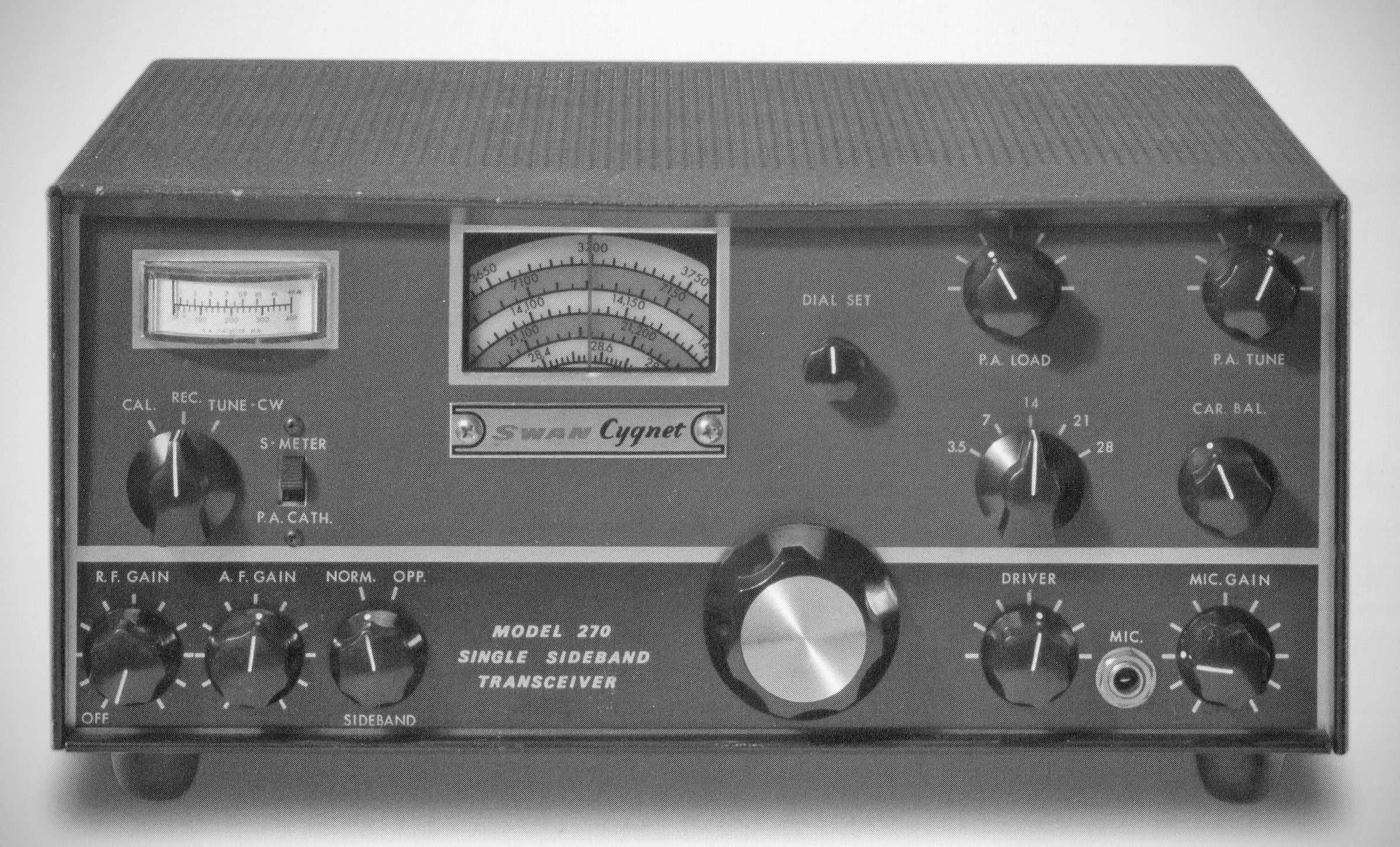The Cygnet 270 was the same size and had the same power as the 260 that came before it, but added new features and performance. The 270 had an S-meter/transmitter tuning meter, selectable sidebands, an improved CF Networks filter, and separate RF and AF gain controls. It offered full coverage of the 80-10 meter bands and also retained the Cygnet 260 internal AC and DC power supplies.