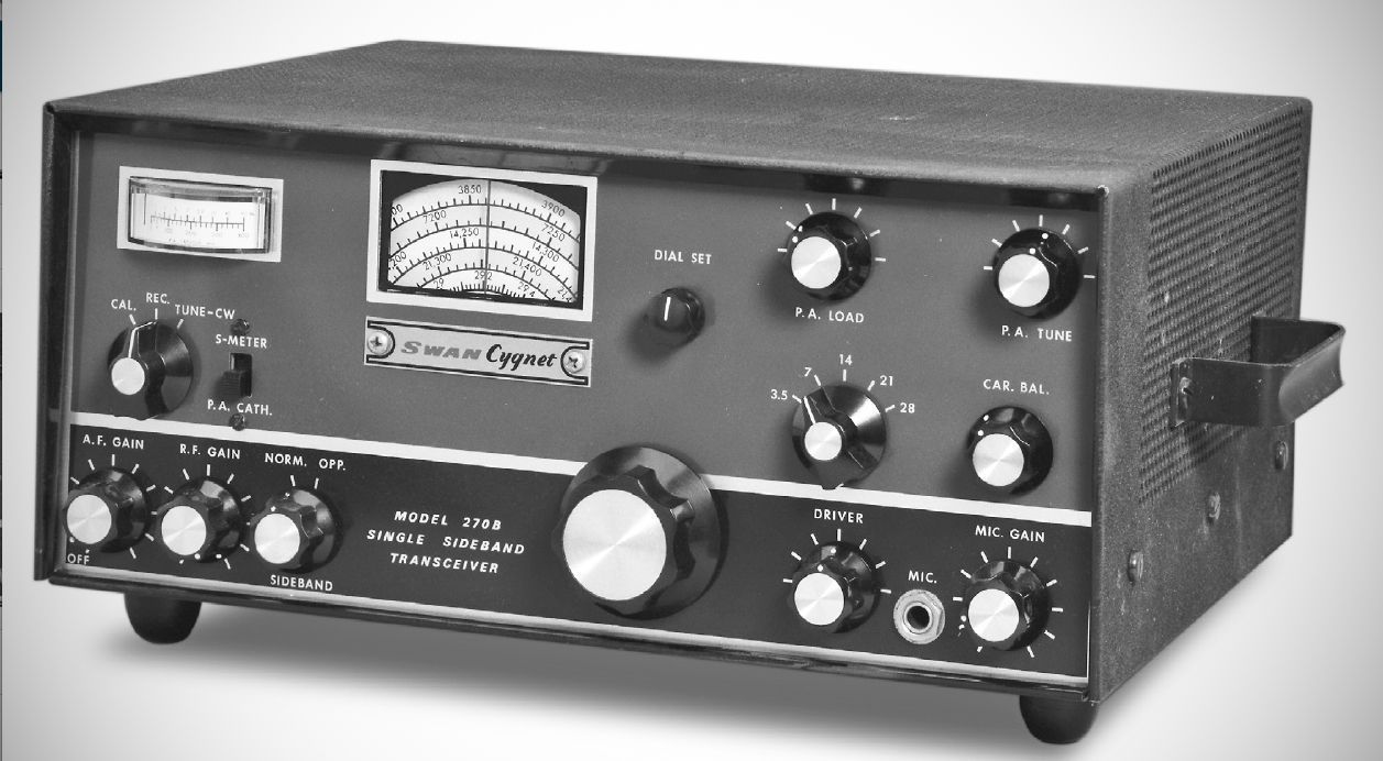 Swan’s Deluxe Cygnet 270B covered 80–10 meters. It ran 260 watts input on SSB, 180 watts with a 6LQ6 power amplifier. The 270B used a 2.7 kHz crystal lattice filter in its 5.5 MHz IF. It had a built-in speaker and AC supply. For 12 VDC operation the Model 14-A plug-in converter was available.