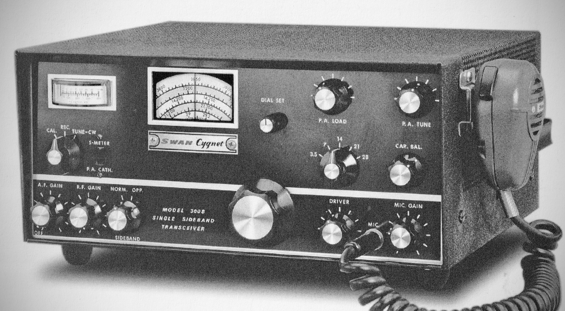 The 300B "Cygnet De Novo" freshened up Swan's Cygnet transceiver series with a built-in AC supply, an internal speaker, CW sidetone, and break-in capability iwth the optional VOX accessory. It ran 300 watts PEP and covered 80–10 meters.