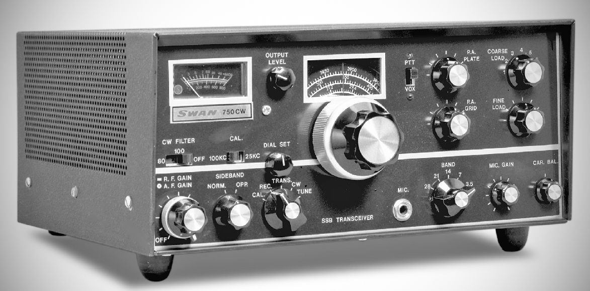 The 750CW transceiver covered 80–10 meters, running 700 watts PEP input on SSB and 400 watts DC on CW. It included an audio filter for CW with 80 or 100 Hz bandwidths. The crystal calibrator had selectable 25 or 100 kHz markers.