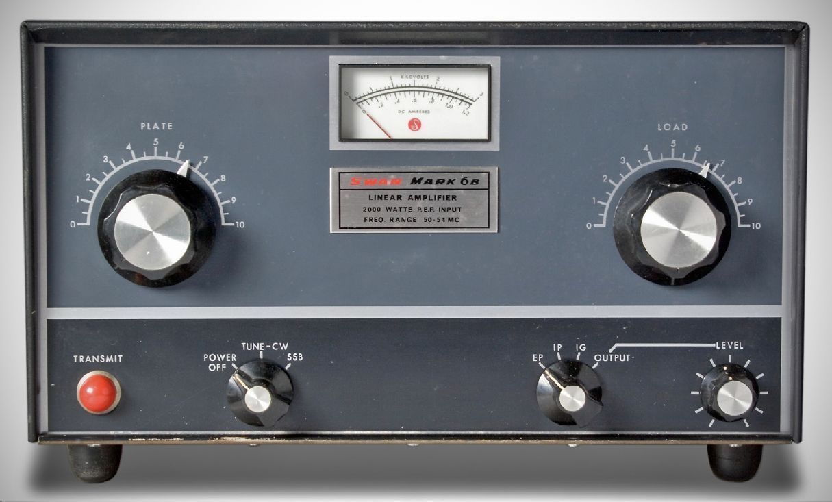Swan’s Mark 6B linear amplifier ran 2000 watts PEP input on 6 meters. The power supply was a separate, matching unit. The Mark 6B used a pair of 3-500Z triodes in grounded grid. It required 100 watts drive for maximum legal input.