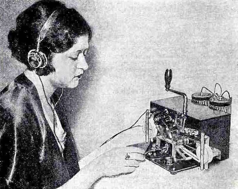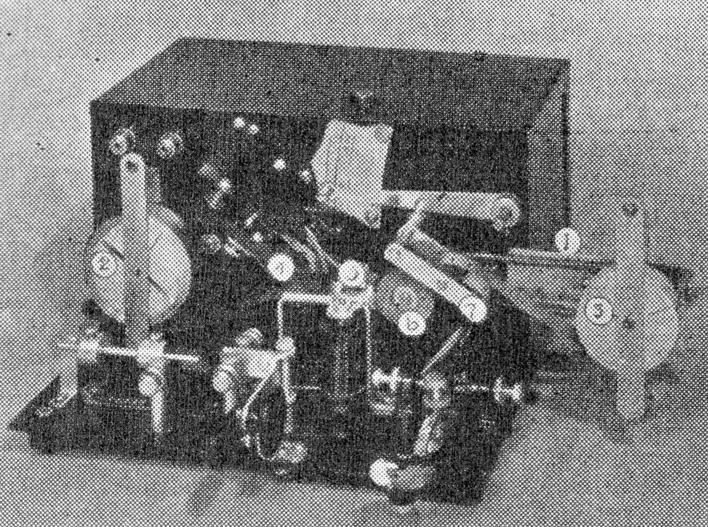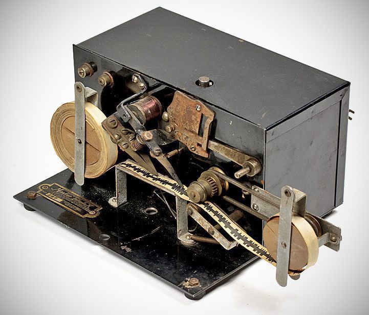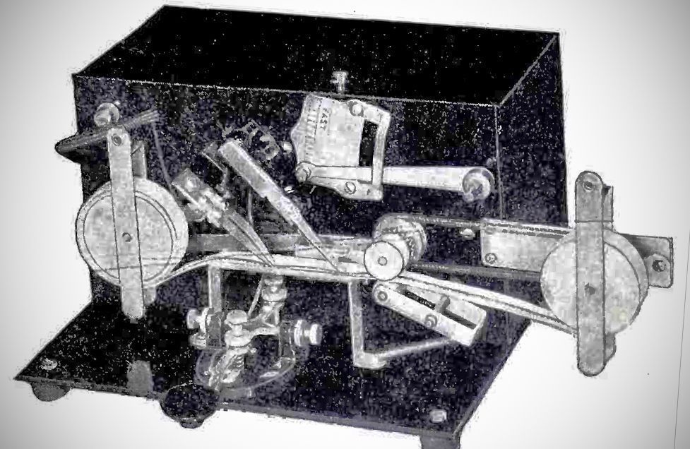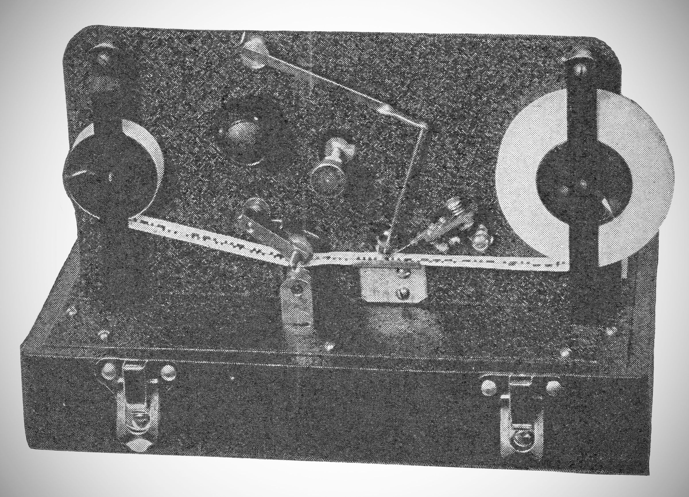 The first machine (Figure 1), introduced n 1932, recorded the operator's sending by applying ink marks on copper tape that correspond to the dots and dashes sent. During playback, the ink marks provide non-conductive areas on the tape which interrupted the flow of current, triggering an oscillator. Presumably then, the tapes could be wiped clean and reused. The variable speed drive mechanism that pulled the tape through the machine was wound with a crank. The tones made during operation were made with a battery powered 3-volt vacuum tube oscillator.