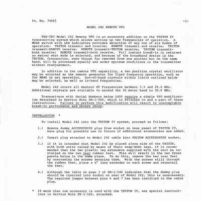 The remote VFO for 540/544 transceivers had six modes: TRANSCEIVER transmit and receive, REMOTE transmit and receive, TRANSCEIVER transmit-remote receive, REMOTE transmit-transceiver receive, TRANSCEIVER transmit-BOTH receive, and REMOTE transmit-BOTH receive. The 242 also had two crystal positions for fixed frequency operation;