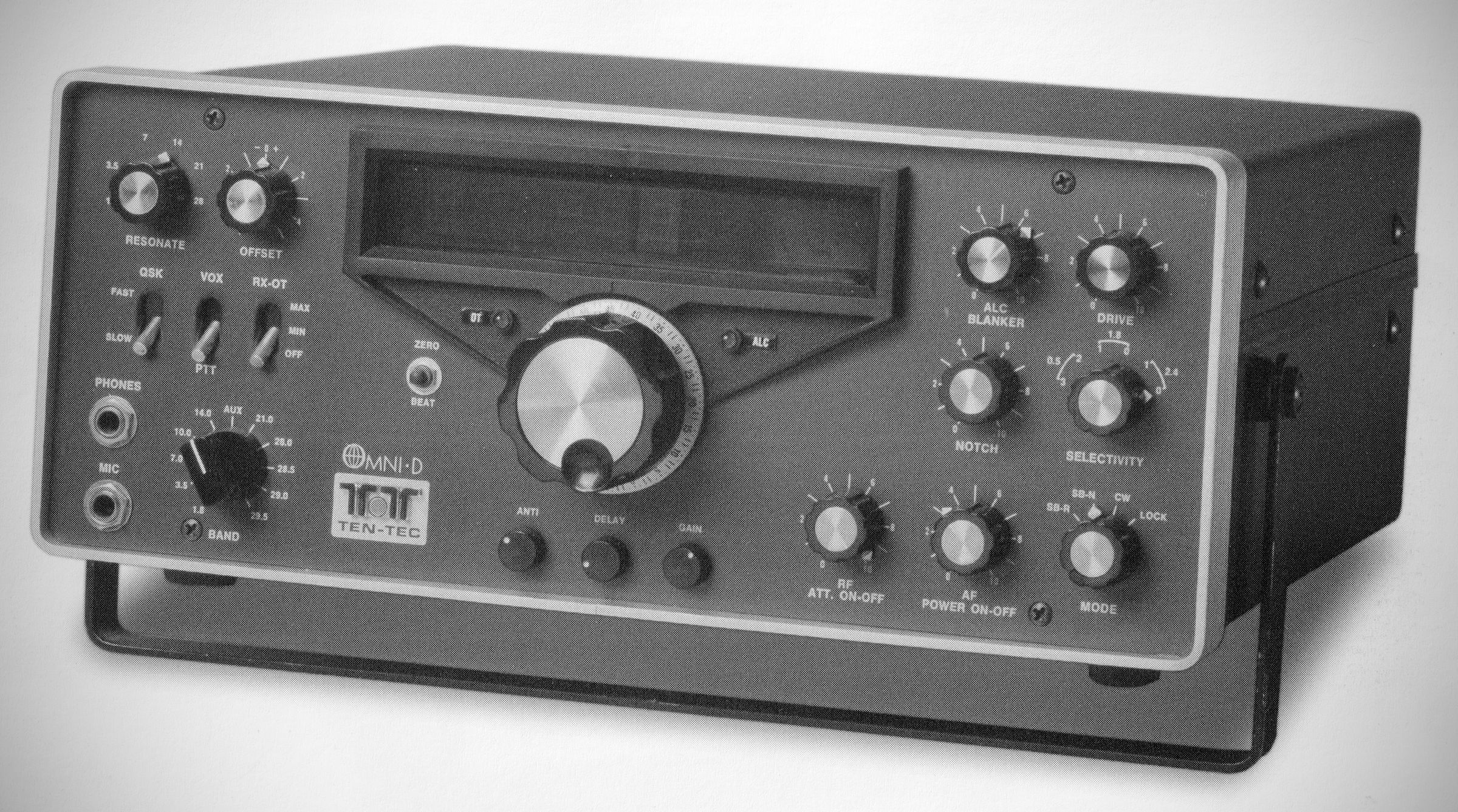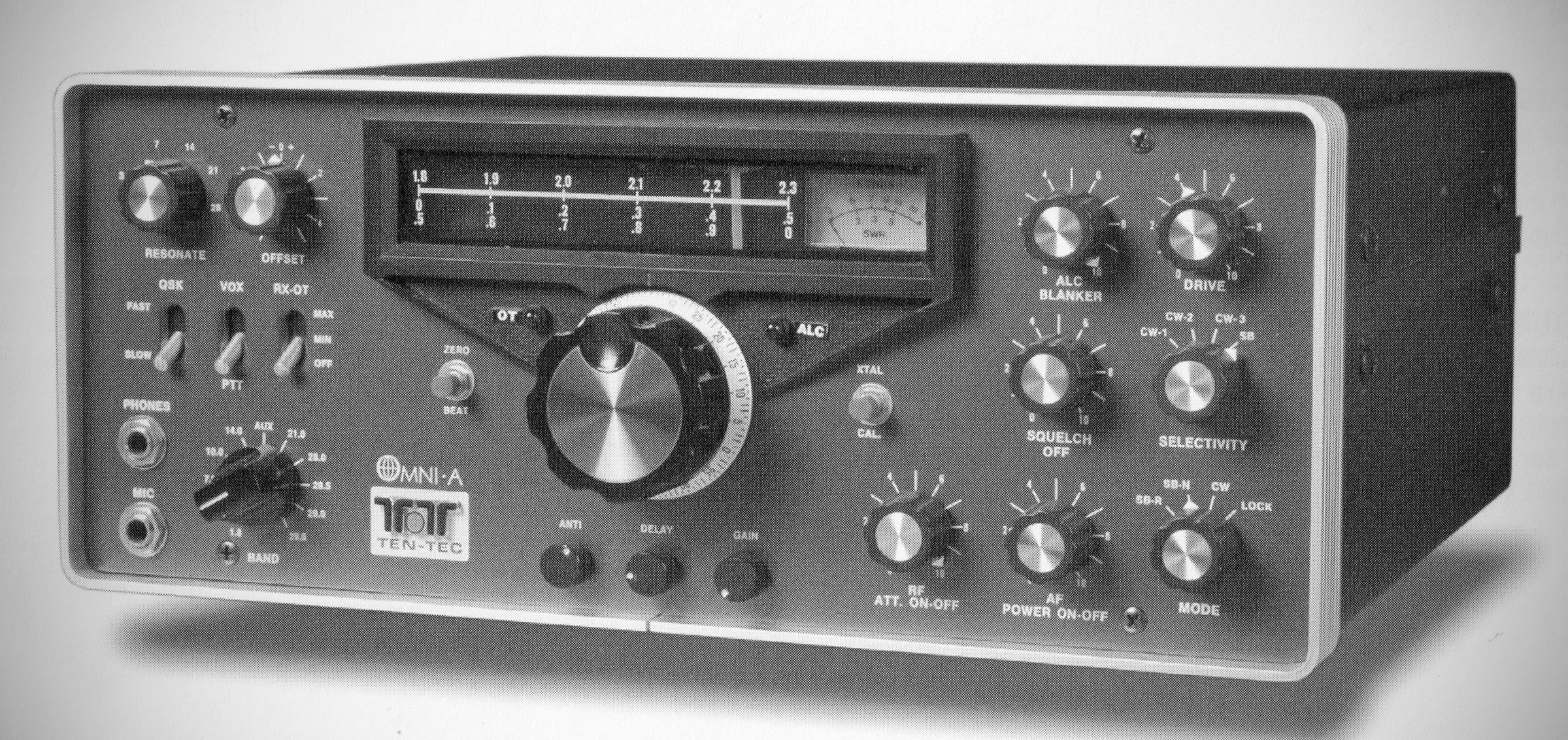 The Model 545 Omni-A and its companion Omni-B replaced the Triton series as Ten-Tec's premier transceivers. The Omni-A had an analog dial. It covered 16D-10 meters and had 10 MHz WWV and AUX positions on the band switch to accommodate future allocations. The Omni had two-speed break-in and two offset ranges on the RIT. The 8-pole, 2.4 kHz sideband filter was complemented by a 150 Hz active filter for CW which had three selectable skirt contours. Power input was 200 watts.