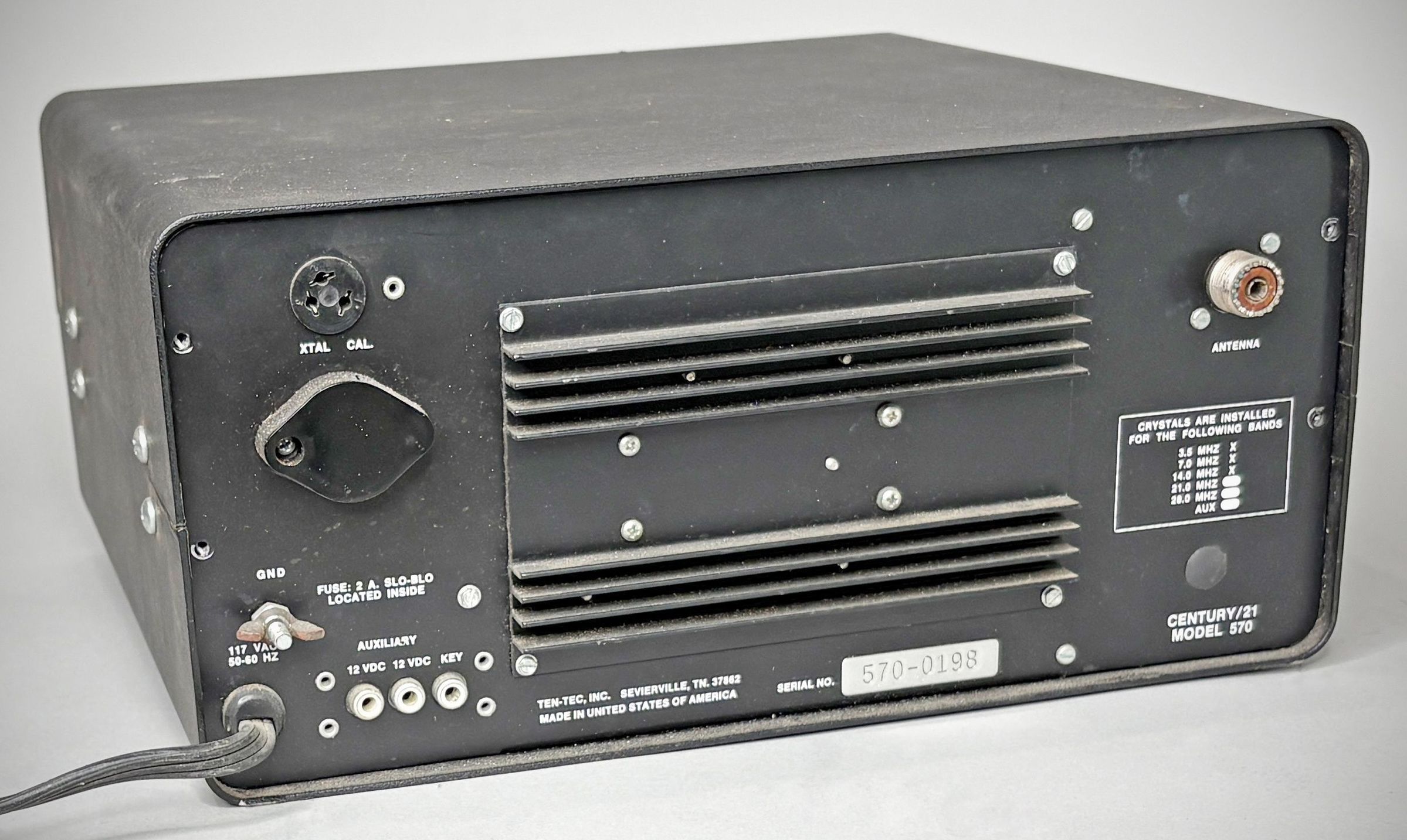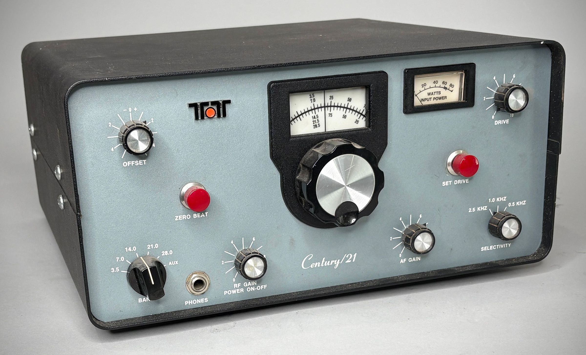 The Century 21 solid-state transceiver ran 70 watts CW input on 80-10 meters. Coverage on 10 meters was the lower 1 MHz of the band. It featured full OSK and a three-position audio filter. The receiver was a double direct conversion design. The 120 VAC power supply was built-in.