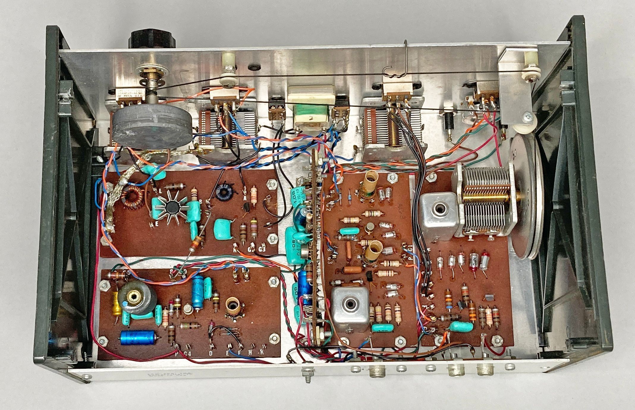 In addition to these four modules, the PM-1 also included the AC1 (also sold separately for $7.95, which included an amplifier current meter, antenna switch, knob, and connector), a flywheel tuning assembly, a slide rule dial, front panel band changing controls, a VFO-crystal switch, and an aluminum chassis.