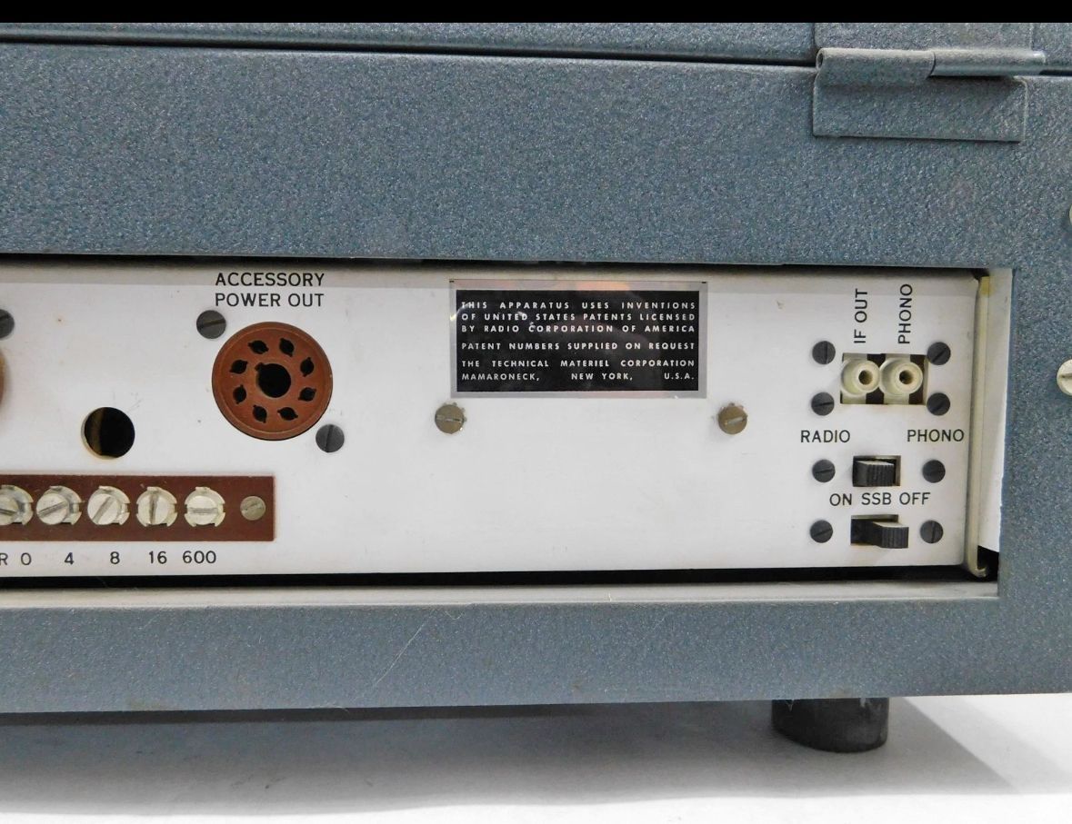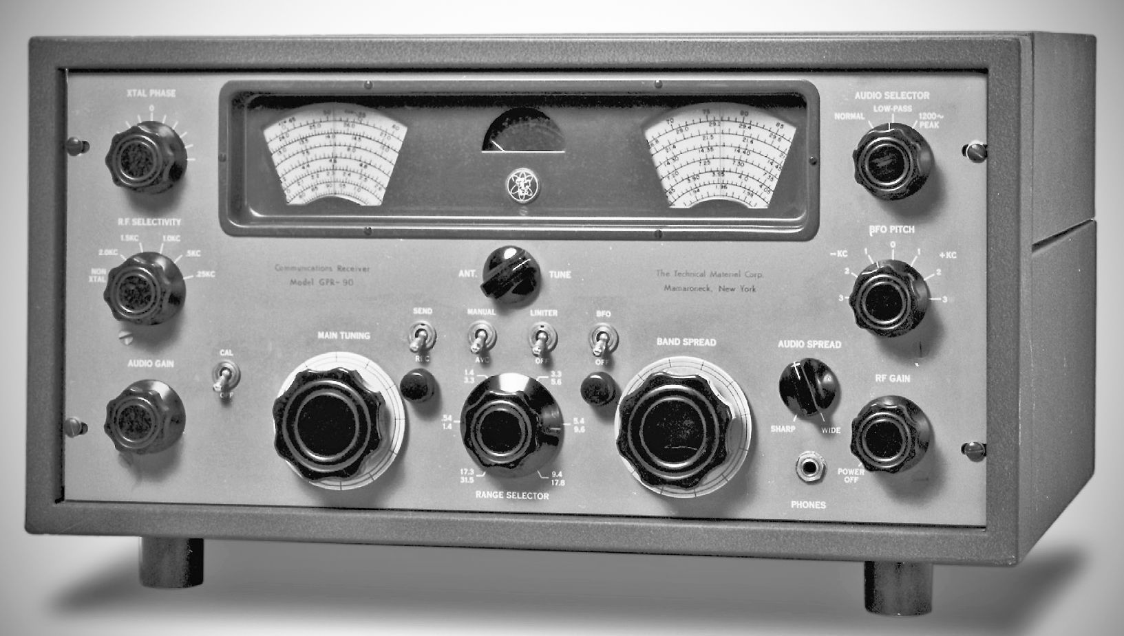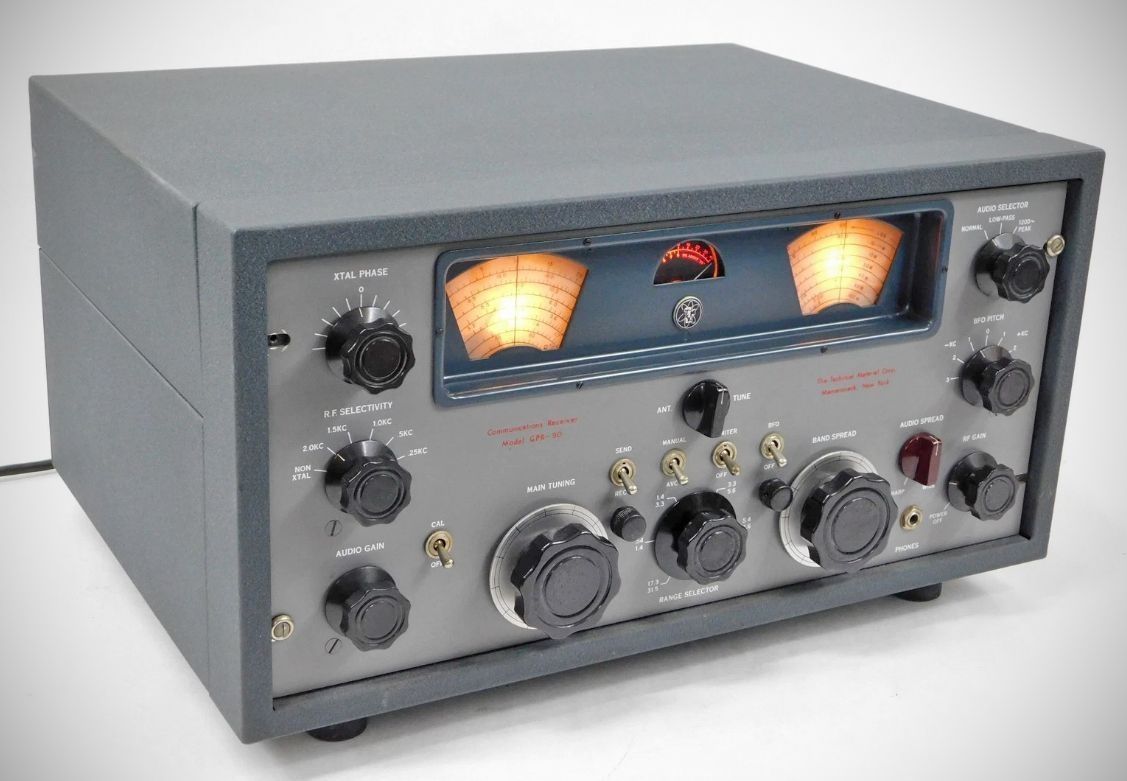 The GPR-90 receiver from the Technical Materiel Corporation also carried the R-825/URR military designator. The 15-tube, double-conversion set was single-conversion below 3.2 MHz. It covered .54–31 MHz. It used a crystal filter and offered selectivity from 200 Hz to 5 kHz in six steps.