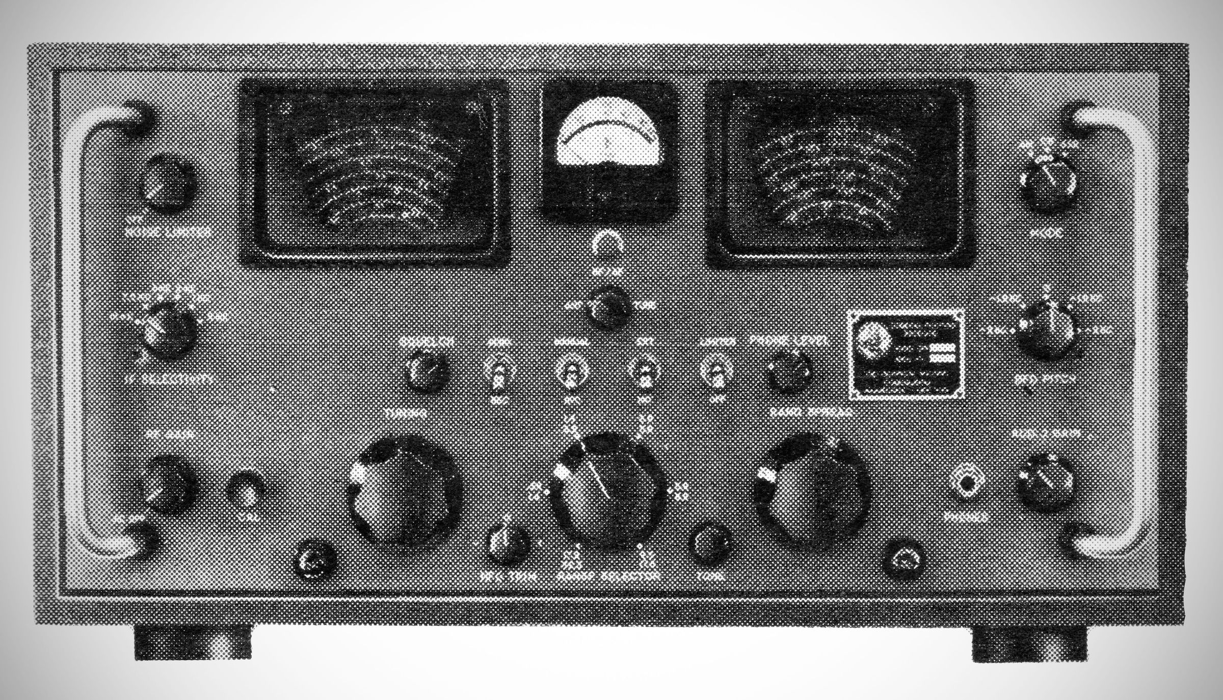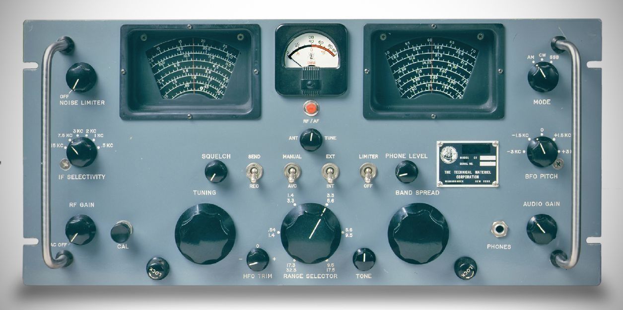 The Technical Materiel Corporation produced scarcely more than 100 examples of the GPR-92 receiver. The 18-tube set covered 0.54–32 MHz in five bands. The receiver shown here has amateur band calibration on the band-spread dial. Other versions were made with commercial or broadcast-band spread; $920.00, 1963. (1)
