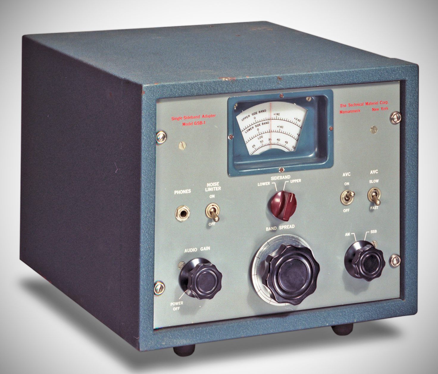 The GSB-1 SSB adapter was a filter-type slicer made to match TMC’s GPR-90 receiver. It could be used with other receivers with a 455 kHz IF. The GSB-1 converted the IF signal down to 17 kHz. It had an upper/lower side-band tuning range of +/– 3 kHz and AVC and noise-limiter circuits.