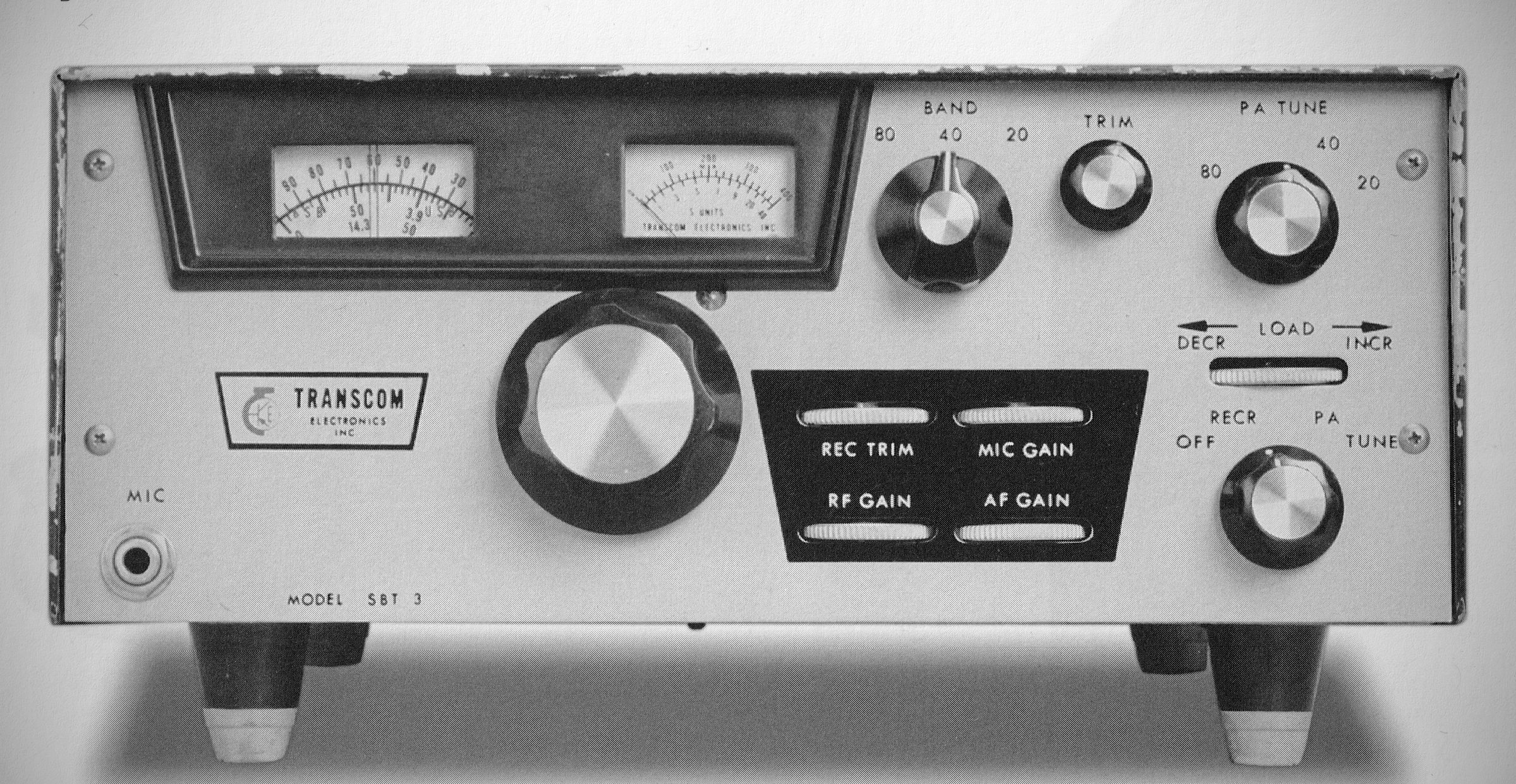 The Transcom SBT-3 transceiver covered the phone portions of 75, 40, and 20 meters. It used 18 transistors and ran 165 watts PEP input to its final. The tubes used, a pair of 8042s, were instant-heating types and the filaments remained off during receive cycles. The SBT-3 operated on the normal sideband for the band in operation. It required a separate power supply. Transcom Electronics, Inc. was located in Escondido, California.