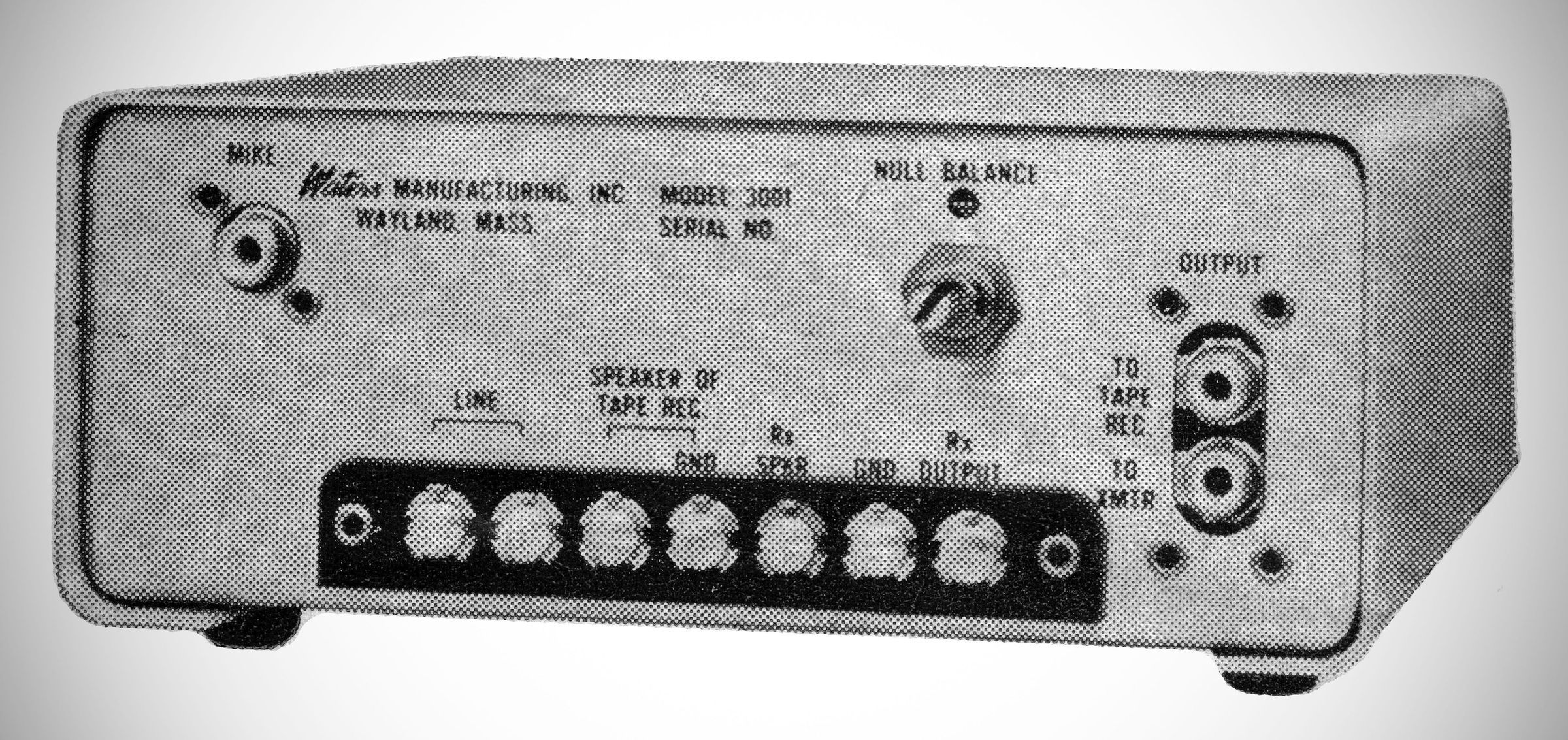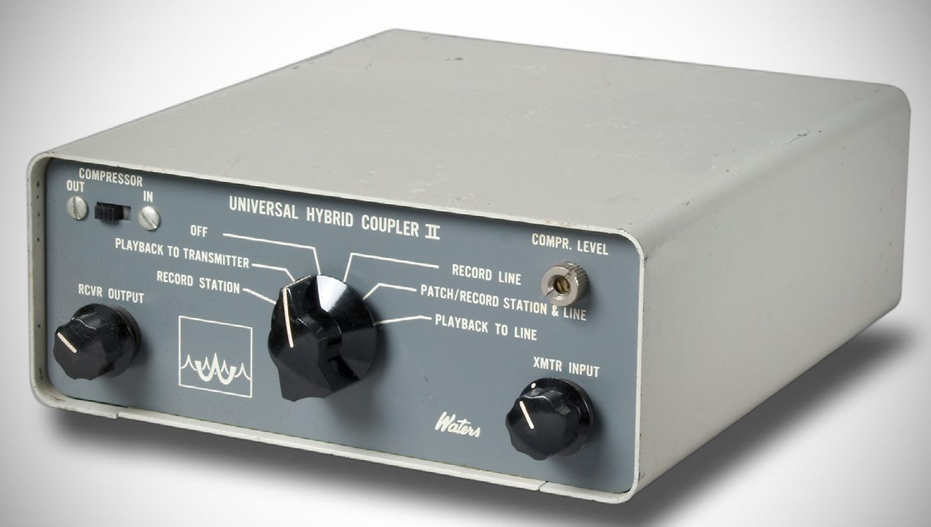 Waters’ model 3001 Universal Coupler and phone patch not only connected a transmitter and receiver to the phone line, but also had functions for transcribing with a tape recorder or playing taped messages over the air. Its hybrid circuitry allowed VOX operation of the station. Model 3002 is the same as 3001, but includes Waters “Compreamp” speech processor.