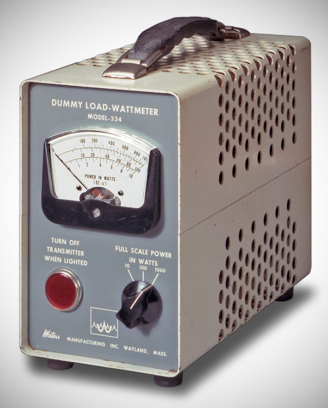 The Waters Model 334 Dummy Load/Wattmeter was identical to the instrument sold later by Barker & Williamson. Many Waters products reappeared with B & W’s name after they bought the Waters company. The 334 was a 52 ohm dummy load that worked up to 230 MHz. Its power meter had 10, 100, and 1000 watt scales. A warning lamp illuminated when the dummy load overheated.