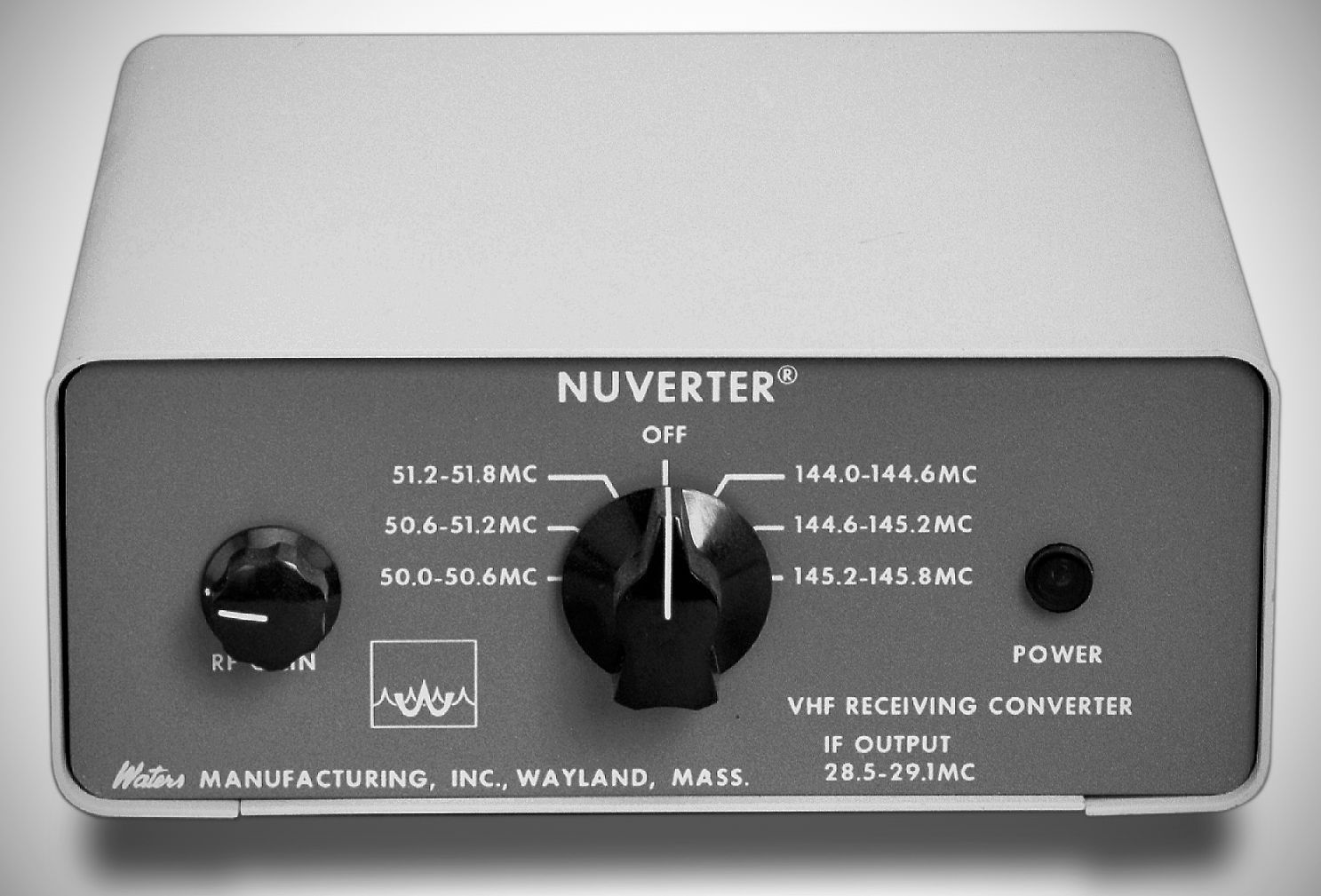 Waters’ nuvistor converter provided 6 and 2 meter reception with any receiver that tuned the 10 meter band. It covered each of the VHF bands in three 600 kHz segments. The Nuverter had an internal power supply.
