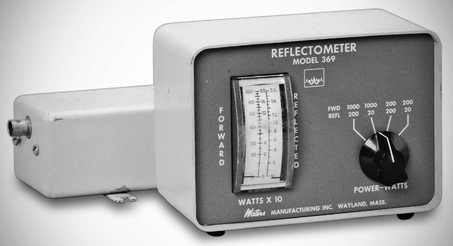 The Waters model 369 Reflectometer simultaneously indicated forward power on 200 and 1000 watt scales and reflected power on 20 and 200 watt scales. The directional coupler was a separate unit that could be placed remotely. It worked from 3 to 30 MHz.