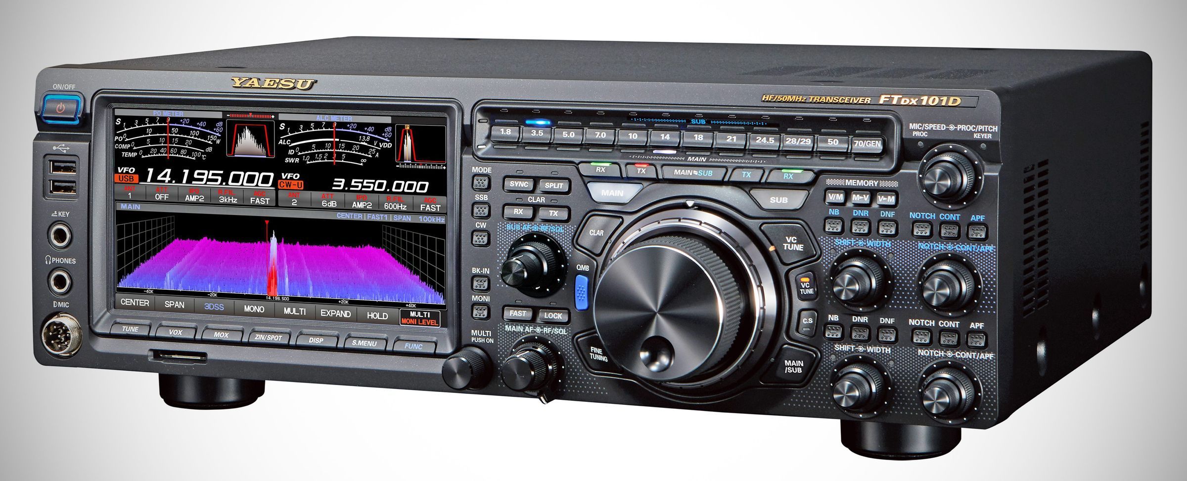 The FT DX 101 series uses a hybrid SDR configuration that integrates a direct sampling SDR receiver in order to view the entire band status in real time, with the excellent dynamic receiver performance achieved by the narrow band SDR receiver circuit.