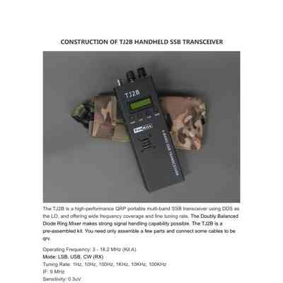 The Youkits TJ2B is a portable QRP multi-band HF SSB transceiver, notable for its compact, handheld design and up to 5W power output. It operates using Direct Digital Synthesis (DDS) and has specific frequency coverage depending on whether it is Kit A or Kit B.