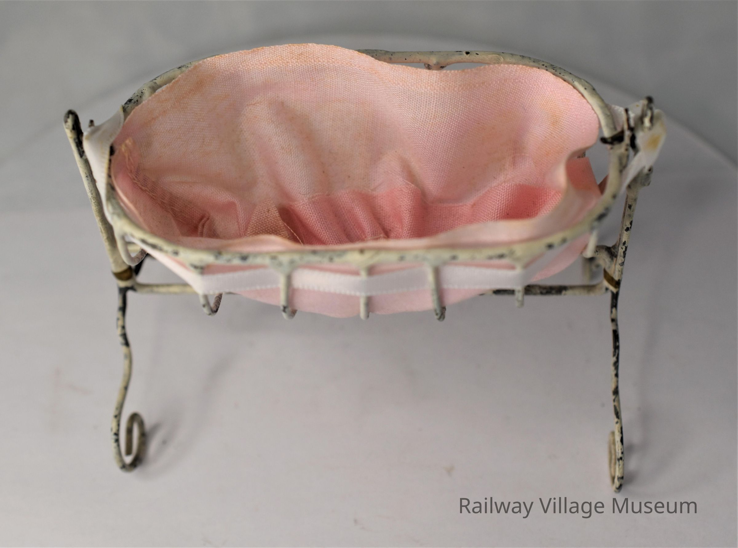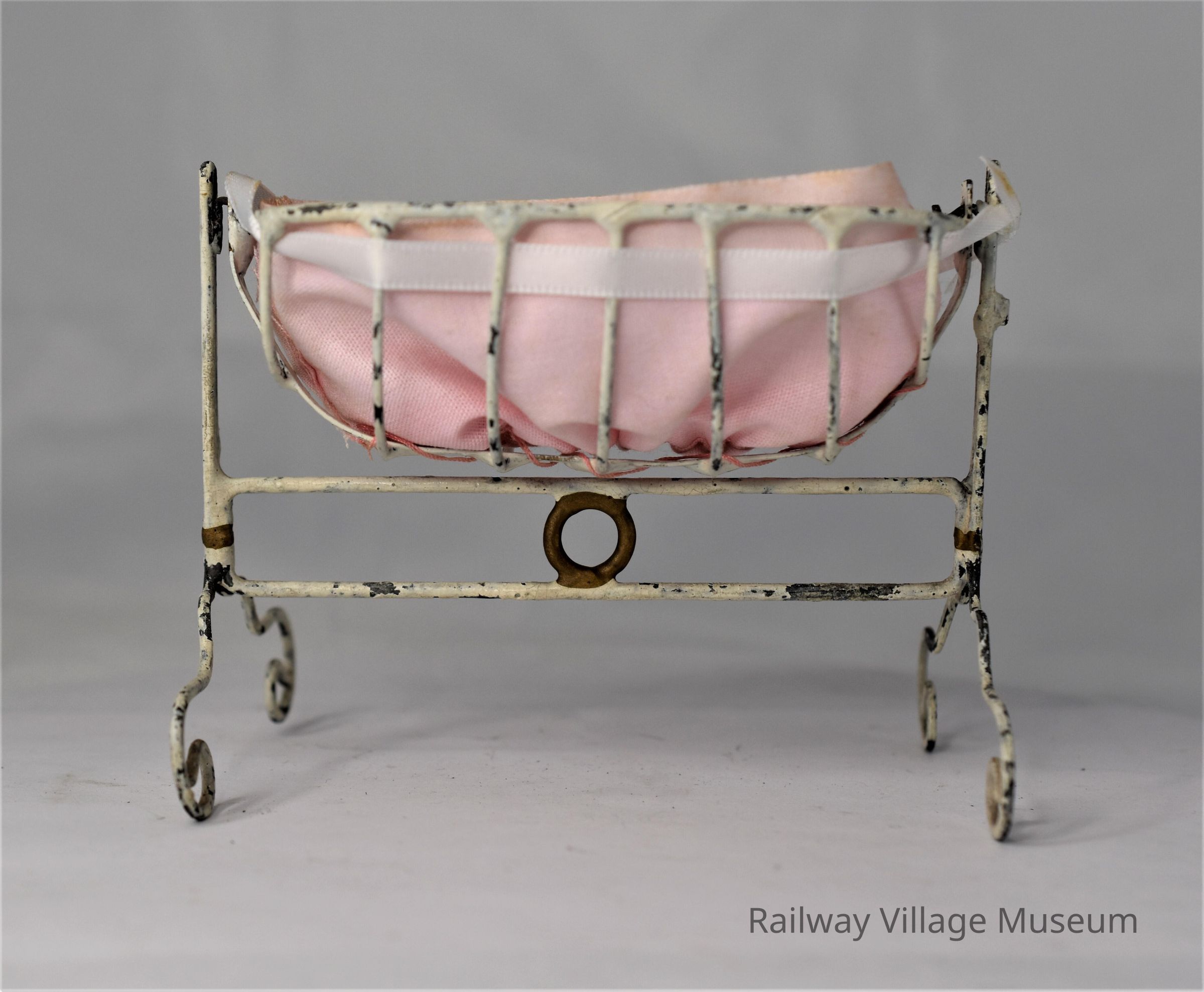A thin metal doll crib, made by an unknown maker. The crib portion swings back and forth on the legs. The inside is covered by a thin pink cloth.