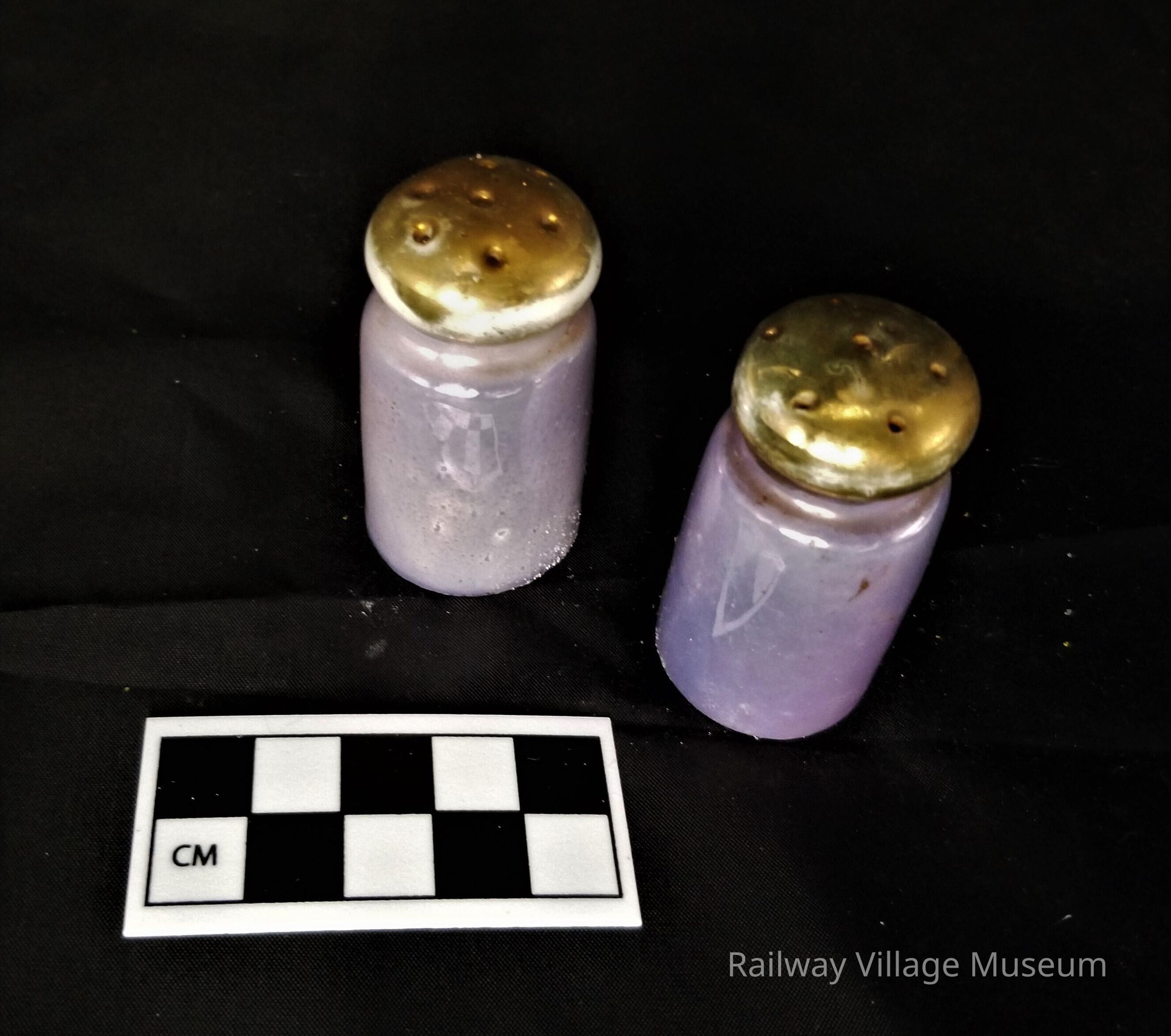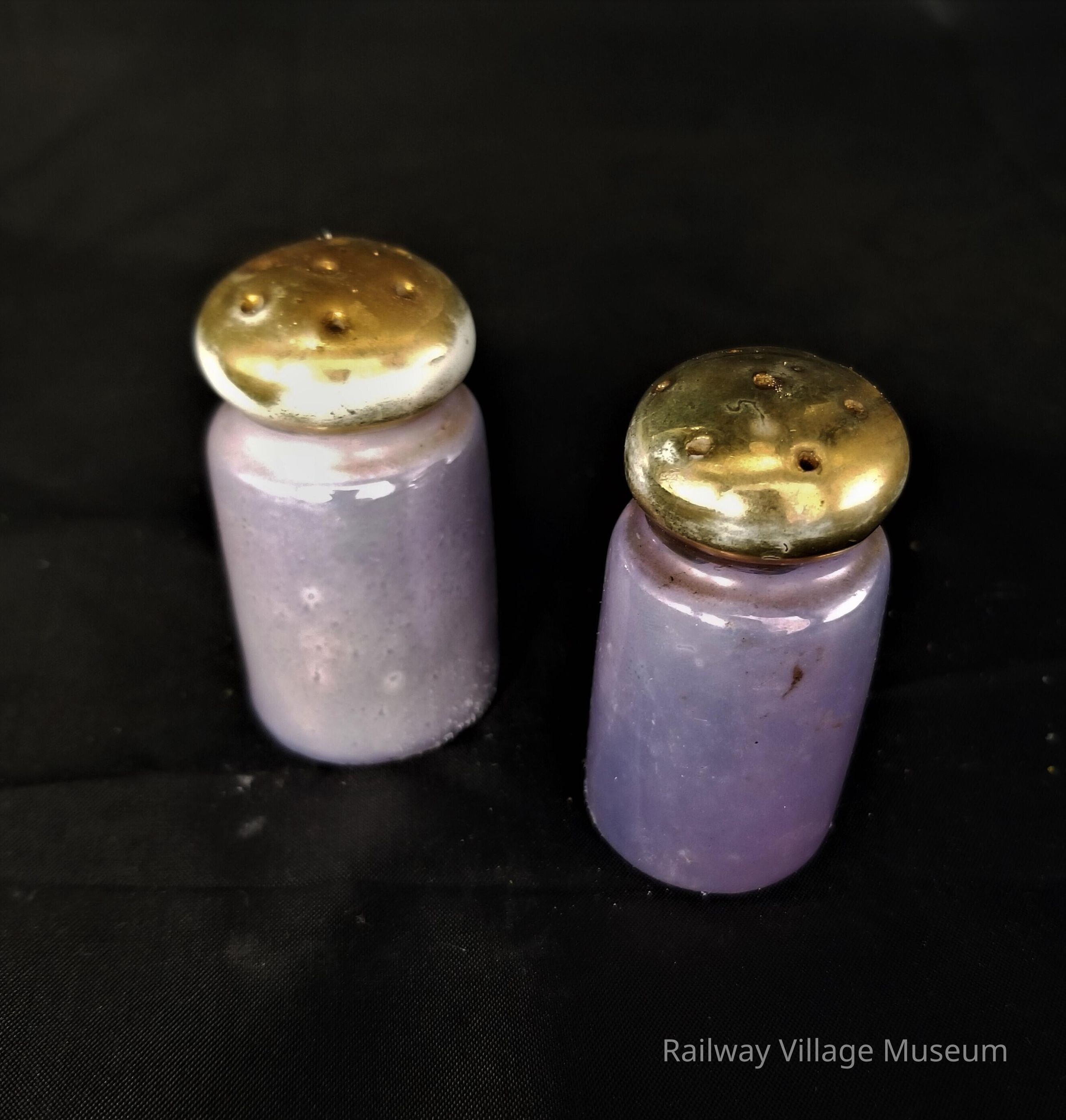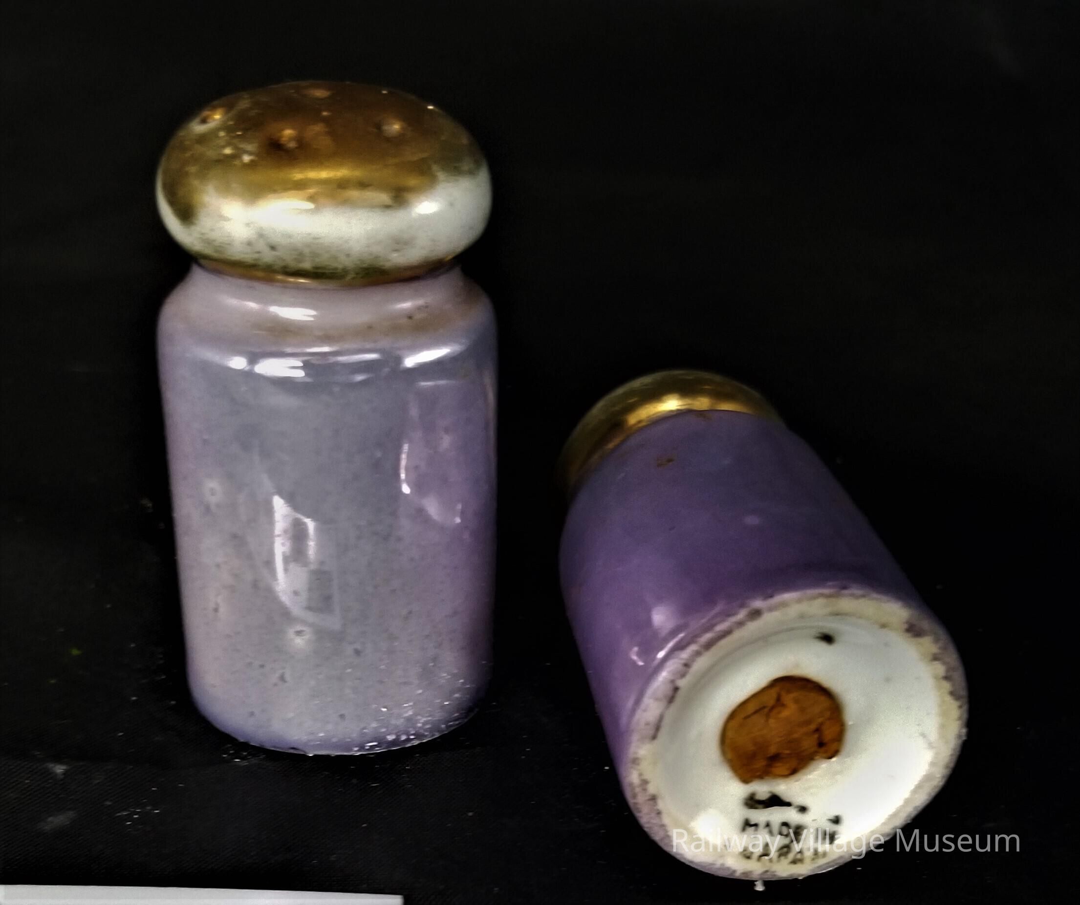 Purple ceramic salt and pepper shakers with gold painted tops. Glazing style is sometimes called "luster". Made in Japan. Cork stoppers intact.
